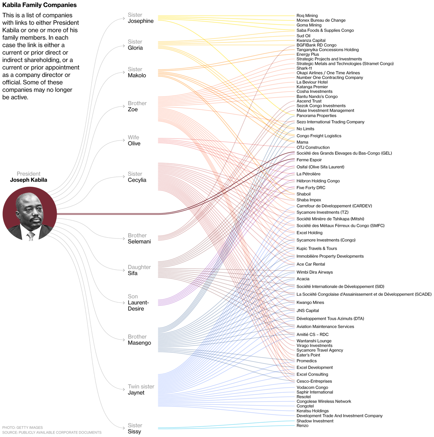 Un autre proche de Kabila, directeur financier du cabinet, Emmanuel Adrupiako, investit depuis 2014 dans l’immobilier de luxe québécois. Il peut compter sur des versements récurrents, qu’il reçoit notamment de deux compagnies basées à Dubaï et liées à Semlex.[note] Kabila et lui sont par ailleurs associés dans deux entreprises d’extraction : Acacia et sa filialeKwango Mines SARL. En 2016, résultant d’une vaste enquête, Bloomberg dévoilait l’empire financier de la famille de Joseph Kabila : il détient des participations dans plus de 100 entreprises extractives du pays, via ses sœurs, frères et autres proches.