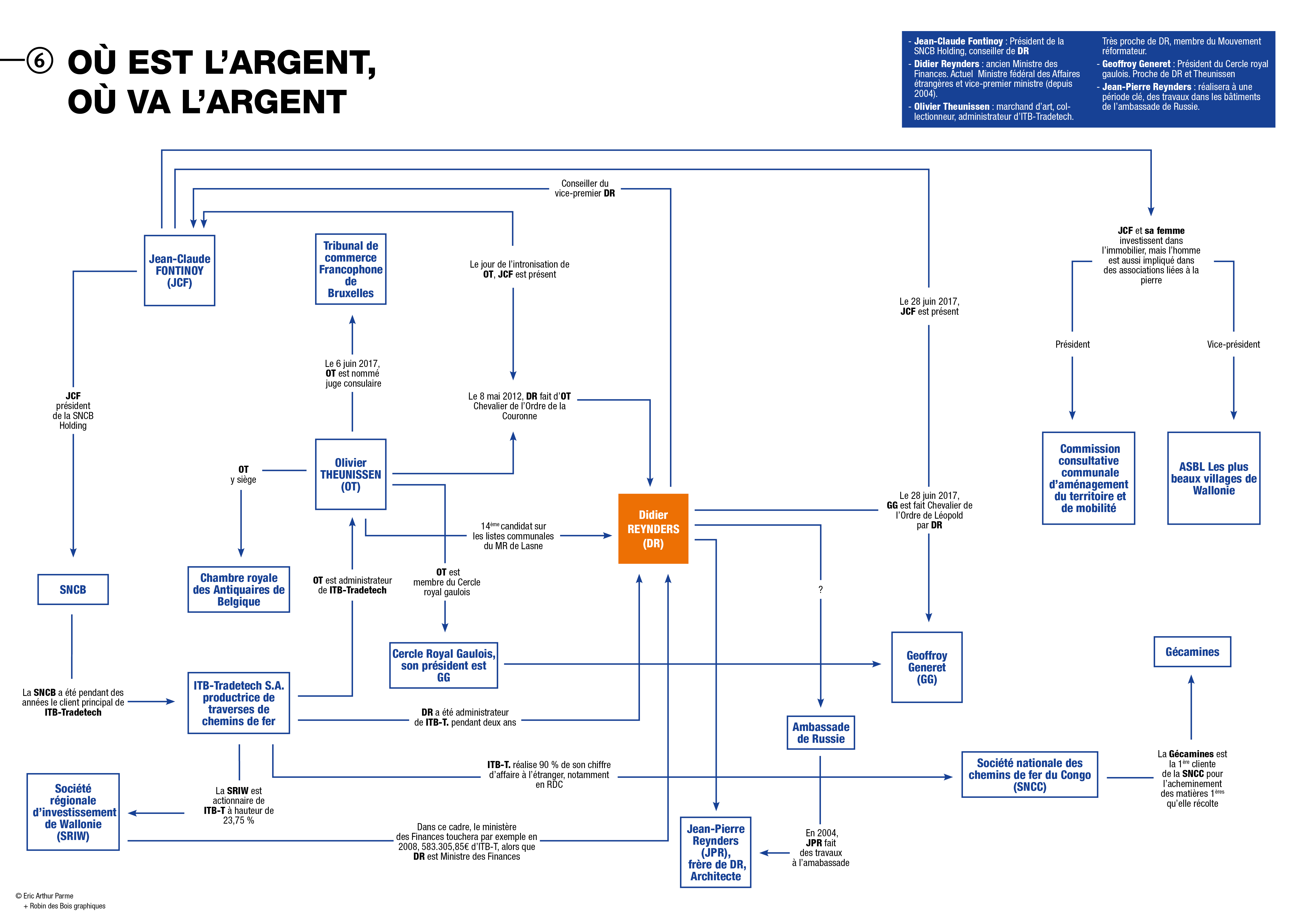 Par arrêté royal du 6 juin 2017, OlivierTheunissen est nommé juge consulaire au Tribunal de Commerce Francophone de Bruxelles, pour un terme de cinq ans (Moniteur belge, 16 juin 2017). Intéressant comme poste, quand on est marchand d’art avec un carnet d’adresses bien rempli. Theunissen était également 14ème candidat sur la liste communale du MR pour les élections d’octobre 2012. Il siège à la Chambre royale des antiquaires de Belgique, est propriétaire d’Antheol SPRL, spécialisée dans les antiquités et les biens d’occasion. Il est aussi membre du Cercle Royal Gaulois, dont le président Geoffroy Generet a reçu des mains de Didier Reynders le 28 juin 2017, la décoration de Chevalier de l’Ordre de Léopold, en présence de… Olivier Theunissen. Le même cercle qui avait été élu « Cercle de l’année 2016 », par le magazine Lobby, récompense remise par Didier Reynders. Il est encore conseiller au Conseil communal de Lasne, Vice-président du CPAS, administrateur à ITB-Tradetech. S A. La société , productrice de traverses de chemins de fer, réalise 90 % de son chiffre d’affaires à l’étranger, notamment en République démocratique du Congo, avec la société nationale des chemins de fer du Congo (SNCC) et la Gécamines qui est la première cliente de la SNCC, cette dernière assurant le transport des produits miniers et des biens de consommation de la Gécamines. ITB rémunère bien ses actionnaires, mais aussi le ministère des Finances « à raison de… 583.305,85Un client fidèle !, », s’en amusait le ministre des Finances de l’époque, Didier Reynders, qui était venu en 2008 prendre part au premier centenaire d’ITB-Tradetech à Genval.[note] Une société qu’il connaît bien puisqu’il en a été le président du conseil d’administration durant deux ans » … Où l’on retrouve à nouveau Jean-Claude Fontinoy, président de la SNCB Holding à l’époque. Curieux n’est-ce pas, ces entremêlements ?