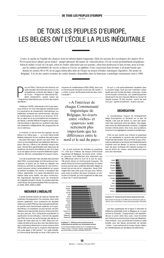 S’il faut retenir une chose, outre le fait qu’une société dotée d’une école tout à fait différente est possible et souhaitable, c’est l’inégalité profonde qui caractérise l’enseignement belge, et à laquelle les mesurettes gouvernementales ne changeront rien, si ce n’est de nous faire croire qu’elles pourront apporter un changement.