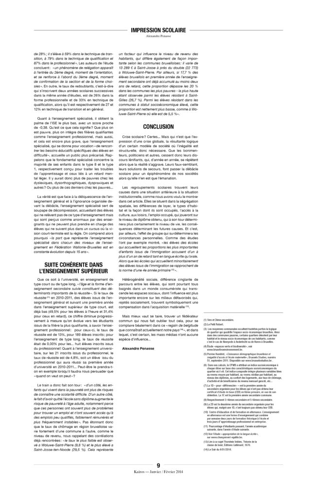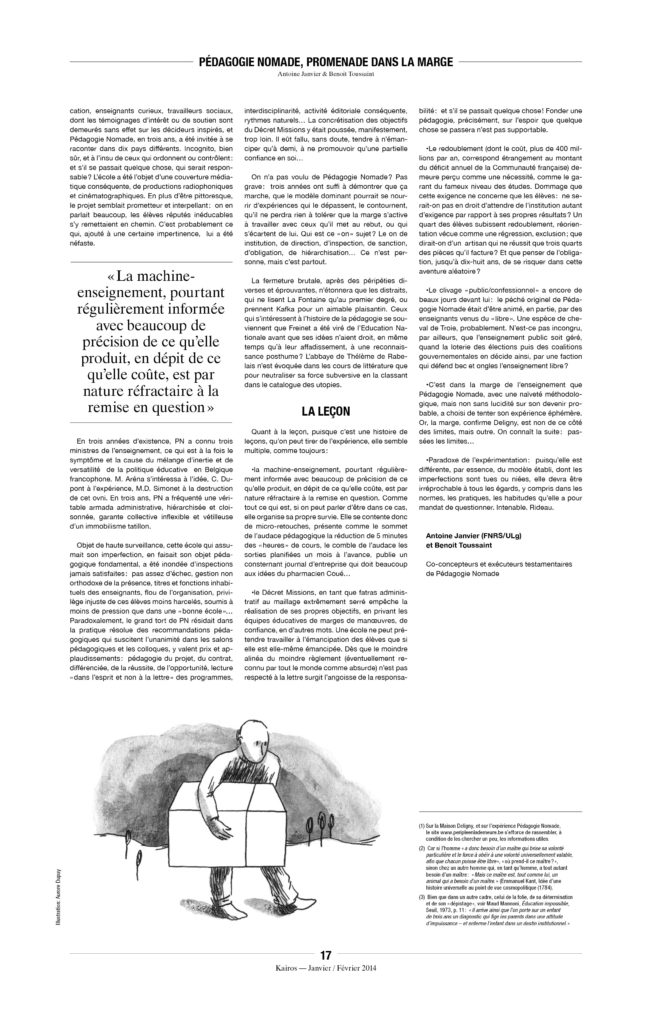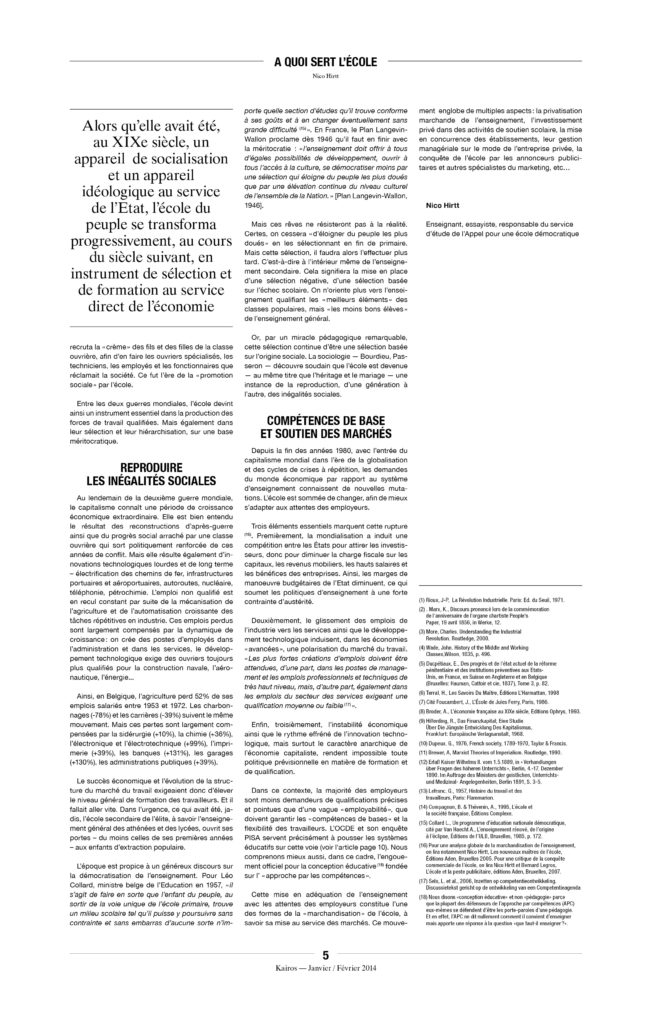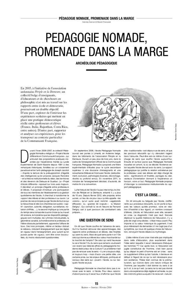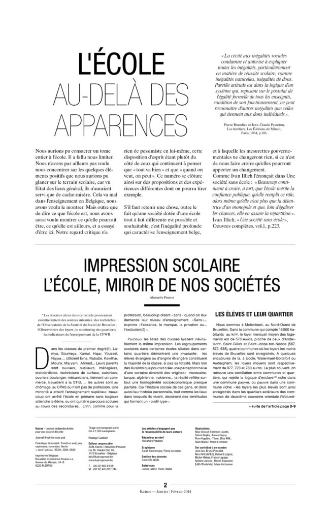 Nous aurions pu consacrer un tome entier à l’école. Il a fallu nous limiter. Nous n’avons par ailleurs pas voulu nous concentrer sur les quelques éléments positifs que nous aurions pu glaner sur le terrain scolaire, car vu l’état des lieux général, ils n’auraient servi que de cache-misère. Cela va mal dans l’enseignement en Belgique, nous avons voulu le montrer. Mais outre que de dire ce que l’école est, nous avons aussi voulu montrer ce qu’elle pourrait être, ce qu’elle est ailleurs, et a essayé d’être ici. Notre regard critique n’a rien de pessimiste en lui-même, cette disposition d’esprit étant plutôt du côté de ceux qui continuent à penser que « tout va bien » et que « quand on veut, on peut ». Ce numéro se clôture ainsi sur des propositions et des expériences différentes dont on pourra tirer exemple.