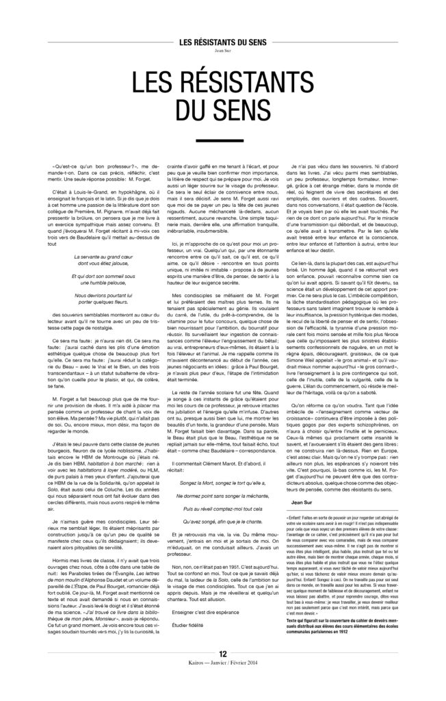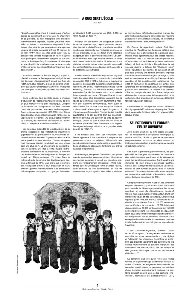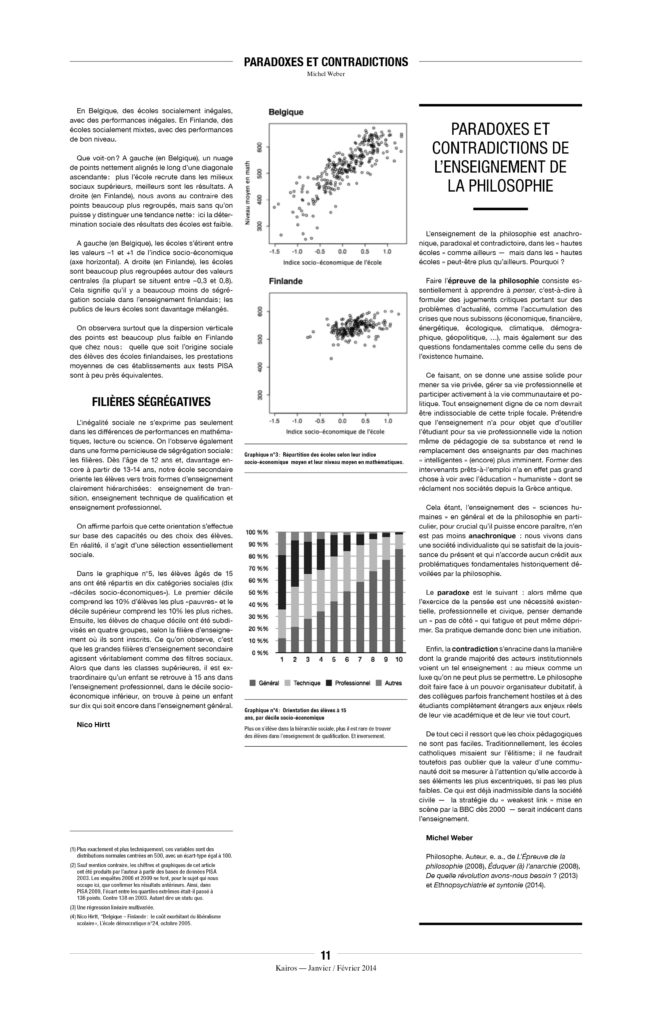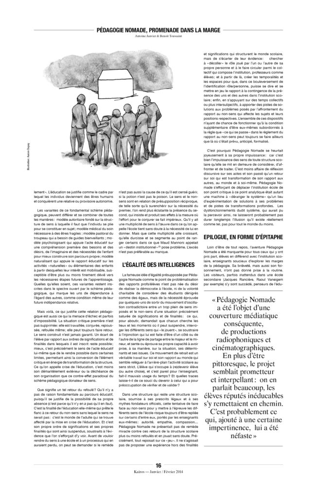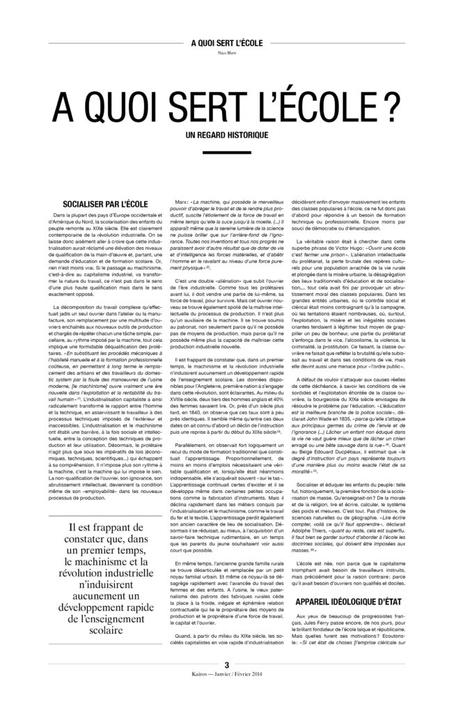 Nous aurions pu consacrer un tome entier à l’école. Il a fallu nous limiter. Nous n’avons par ailleurs pas voulu nous concentrer sur les quelques éléments positifs que nous aurions pu glaner sur le terrain scolaire, car vu l’état des lieux général, ils n’auraient servi que de cache-misère. Cela va mal dans l’enseignement en Belgique, nous avons voulu le montrer. Mais outre que de dire ce que l’école est, nous avons aussi voulu montrer ce qu’elle pourrait être, ce qu’elle est ailleurs, et a essayé d’être ici. Notre regard critique n’a rien de pessimiste en lui-même, cette disposition d’esprit étant plutôt du côté de ceux qui continuent à penser que « tout va bien » et que « quand on veut, on peut ». Ce numéro se clôture ainsi sur des propositions et des expériences différentes dont on pourra tirer exemple.