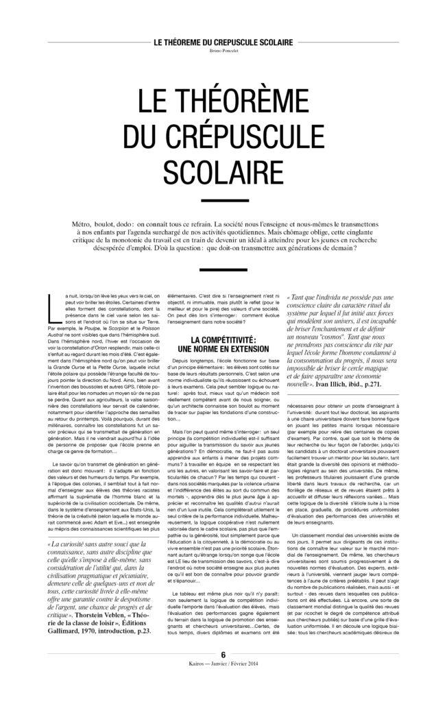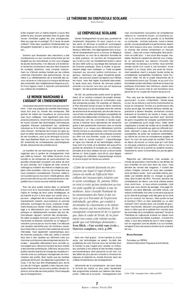 Comme Ivan Illich l’énonçait dans Une société sans école : « Beaucoup continuent à croire, à tort, que l’école mérite la confiance publique, qu’elle remplit ce rôle, alors même qu’elle n’est plus que la détentrice d’un monopole et que, loin d’égaliser les chances, elle en assure la répartition ». Ivan Illich, « Une société sans école », Oeuvres complètes, vol.1, p.223.