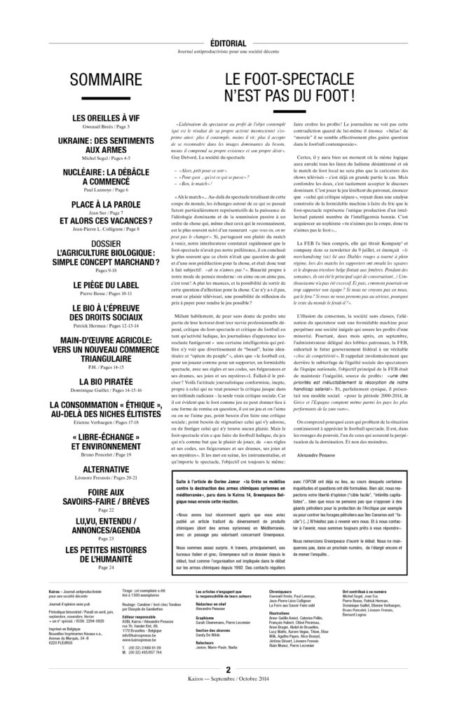 L’illusion du consensus, la société sans classes, l’alié- nation du spectateur sont une formidable machine pour perpétuer une société inégale qui assure les profits d’une minorité. Pourtant, deux mois après, en septembre, l’administrateur délégué des lobbies patronaux, la FEB, exhortait le futur gouvernement fédéral à un véritable « choc de compétitivité». Il rappelait involontairement que derrière le subterfuge de l’égalité sociale des spectateurs de l’équipe nationale, l’objectif principal de la FEB était de maintenir l’inégalité, source de profits: «une des priorités est inéluctablement la résorption de notre handicap salarial». Et, parfaitement cynique, il présentait son modèle social: «pour la période 2000-2014, la Grèce et l’Espagne comptent même parmi les pays les plus performants de la zone euro ».
