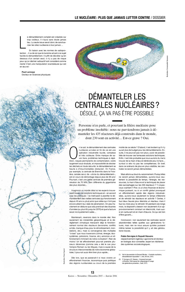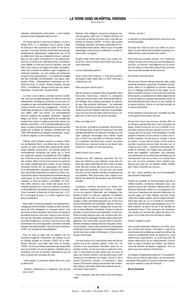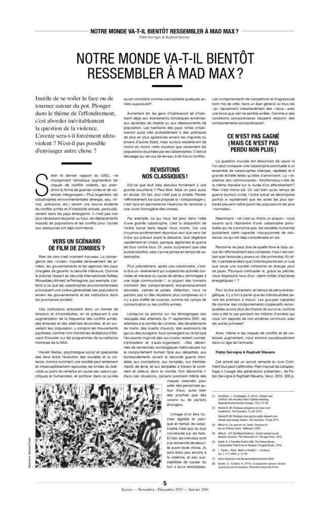 Dans ce combat, il nous faudra nécessairement dire et redire que la continuation du même nous conduit vers le pire. On préférera ainsi parler parfois, ici et là, d’apocalypse, dans le dessein d’éviter le pire, au lieu de ne rien dire et d’inévitablement construire la catastrophe : « “Il vaut mieux prêter l’oreille à la prophétie du malheur qu’à celle du bonheur”. Cela, non par goût masochiste de l’apocalypse, mais précisément pour la conjurer, la politique de l’autruche étant en tout état de cause une forme d’optimisme suicidaire. C’est l’optimisme béat (et passif) qui nous mènera au désastre bien plus sûrement qu’une attitude catastrophiste éclairée qui ne fait que refléter une situation réellement inquiétante »[5].