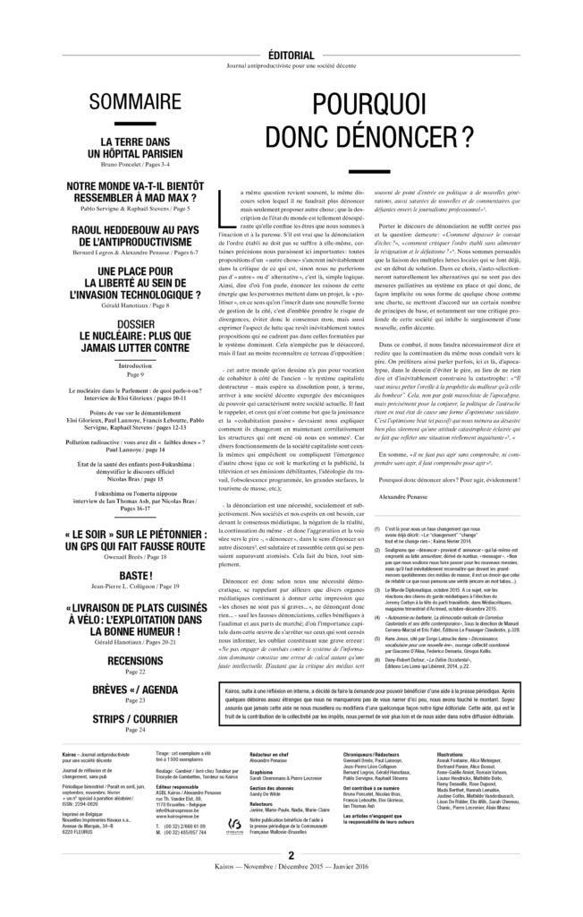 - ↑ Soulignons que « dénoncer » provient d’ annoncer » qui lui-même est emprunté au latin annuntiare, dérivé de nuntius, « messager ». « Non pas que nous voulions nous faire passer pour les nouveaux messies, mais qu’il faut inévitablement reconnaître que devant les grand-messes quotidiennes des médias de masse, il est un devoir que celui de rétablir ce que nous pensons une vérité (encore un mot tabou…).