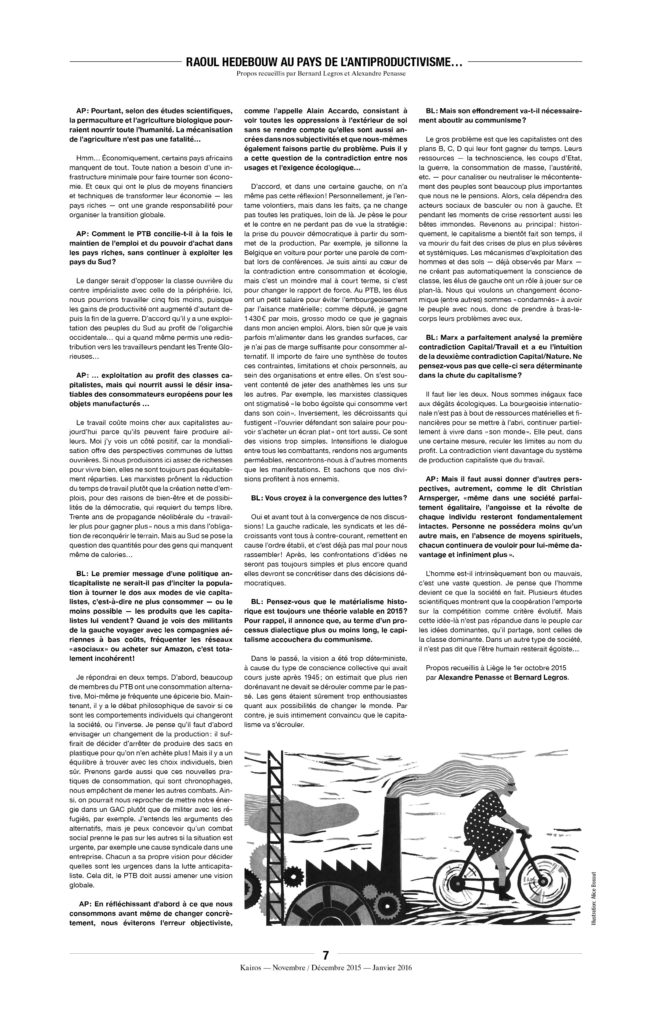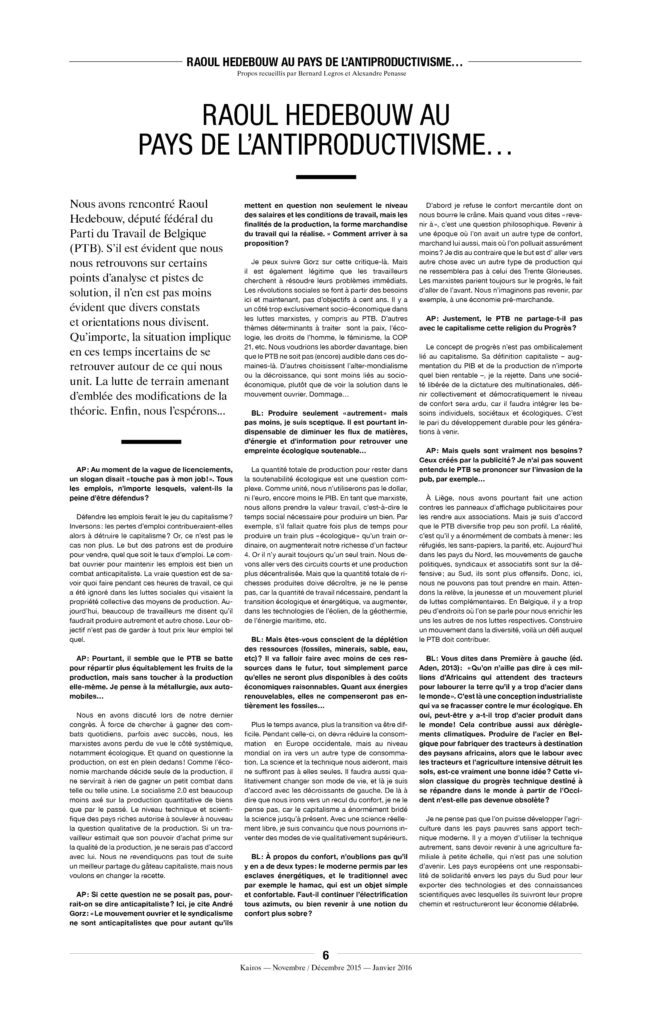 – cet autre monde qu’on dessine n’a pas pour vocation de cohabiter à côté de l’ancien – le système capitaliste destructeur – mais espère sa dissolution pour, à terme, arriver à une société décente expurgée des mécaniques de pouvoir qui caractérisent notre société actuelle. Il faut le rappeler, et ceux qui n’ont comme but que la jouissance et la « cohabitation passive » devraient nous expliquer comment ils changeront en maintenant corrélativement les structures qui ont mené où nous en sommes[1]. Car divers fonctionnements de la société capitaliste sont ceux-là mêmes qui empêchent ou compliquent l’émergence d’autre chose (que ce soit le marketing et la publicité, la télévision et ses émissions débilitantes, l’idéologie du travail, l’obsolescence programmée, les grandes surfaces, le tourisme de masse, etc.);