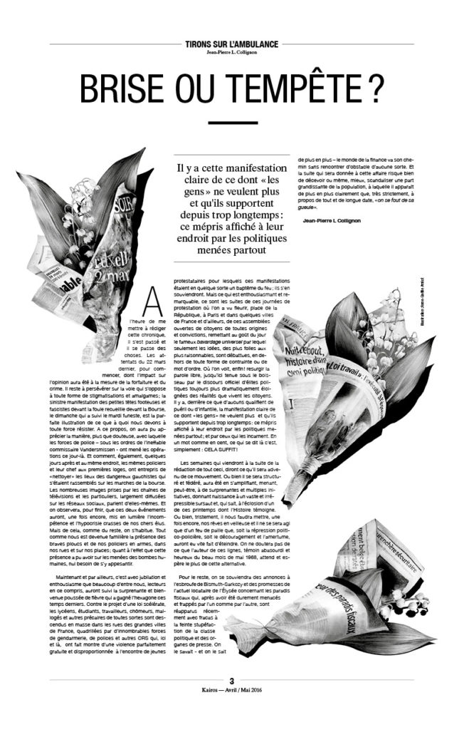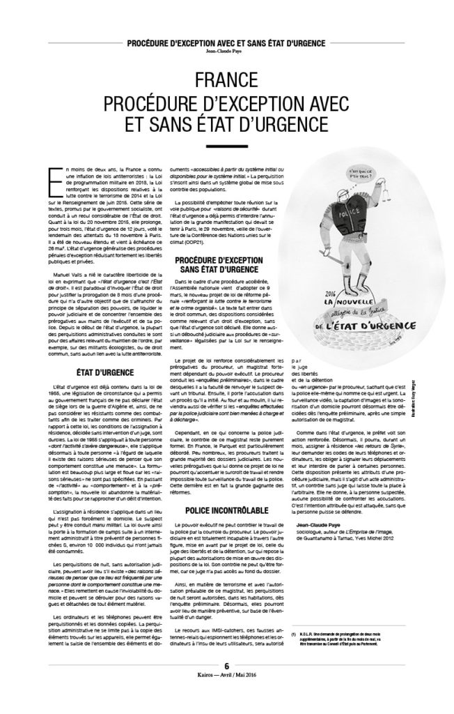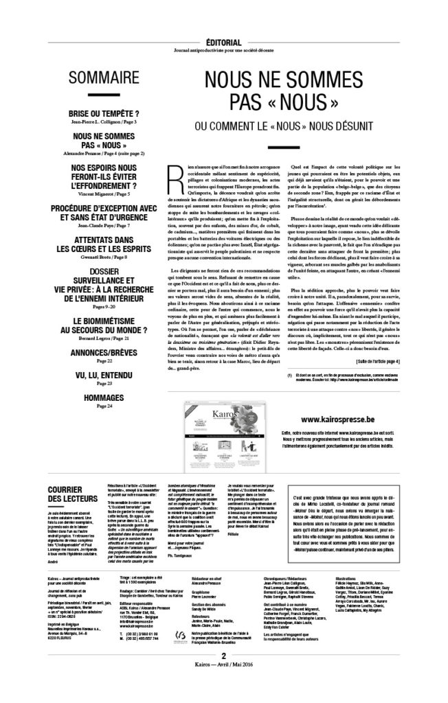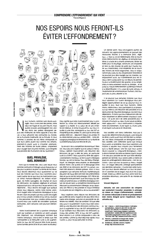 Il est peut-être facile d’être prophète puisque le futur, que par définition nous ne connaissons pas, ouvre à d’infinies interprétations, mais il semble évident que sans reprise en main politique de la vie, et donc d’une véritable démocratie participative qui relègue nos politiciens aux oubliettes et prend en main ce qui est essentiel, les risques à venir pour l’humanité seront inédits. Pour l’instant, « notre » gouvernement pense plutôt à acheter, pour 15 milliards d’euros, 34 avions de chasse pour aller bombarder l’Irak et la Syrie3. Bombardements qui participeront au massacre d’innocents et auront à n’en pas douter leurs effets collatéraux ici.