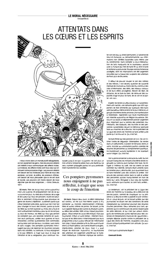 De son côté, l’entreprise médiatico-politique ne nous extrait pas de l’« agir », nous laissant empêtrés, envasés dans l’émotion dont elle profite pour vendre ses produits (commerciaux pour l’un, politico-idéologiques pour l’autre). Elle ne sort pas de la production catégorisante suscitée par l’attaque, où « nous », « unis » dans la lutte, sommes face à « eux »,… Les productions médiatiques profondément pathétiques et consensuelles en offrent la preuve formelle :