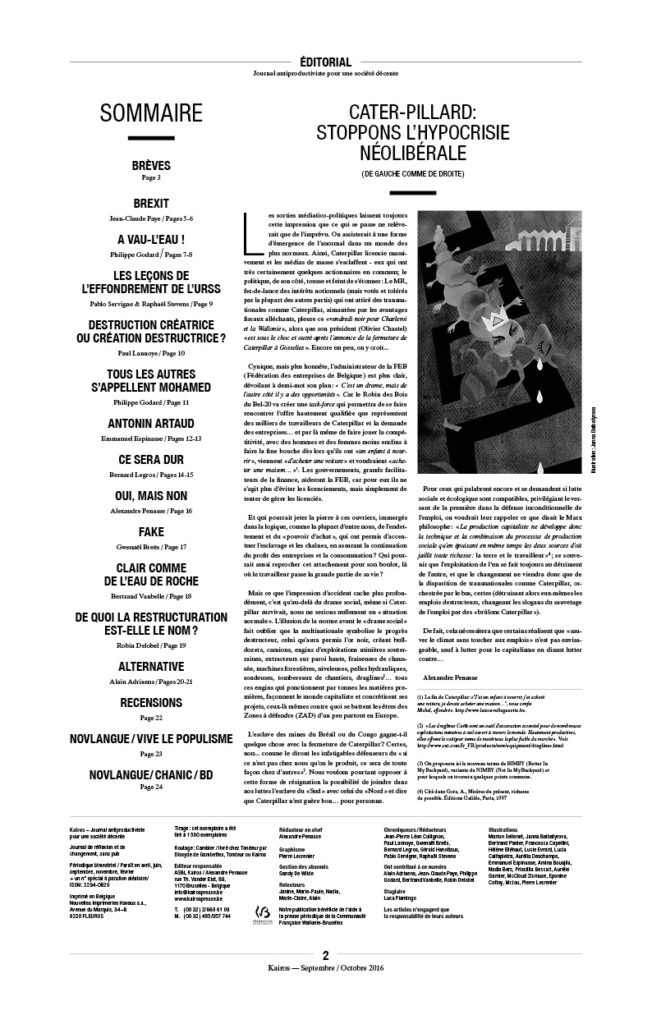 Les sorties médiatico-politiques laissent toujours cette impression que ce qui se passe ne relèverait que de l’imprévu. On assisterait à une forme d’émergence de l’anormal dans un monde des plus normaux. Ainsi, Caterpillar licencie massivement et les médias de masse s’esclaffent – eux qui ont très certainement quelques actionnaires en commun; le politique, de son côté, tousse et feint de s’étonner : Le MR, fer-de-lance des intérêts notionnels (mais votés et tolérés par la plupart des autres partis) qui ont attiré des transnationales comme Caterpillar, aimantées par les avantages fiscaux alléchants, pleure ce « vendredi noir pour Charleroi et la Wallonie », alors que son président (Olivier Chastel) « est sous le choc et outré après l’annonce de la fermeture de Caterpillar à Gosselies ». Encore un peu, on y croit…