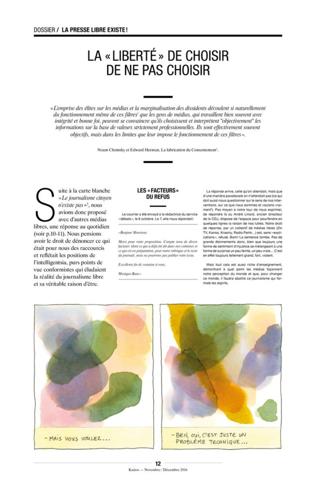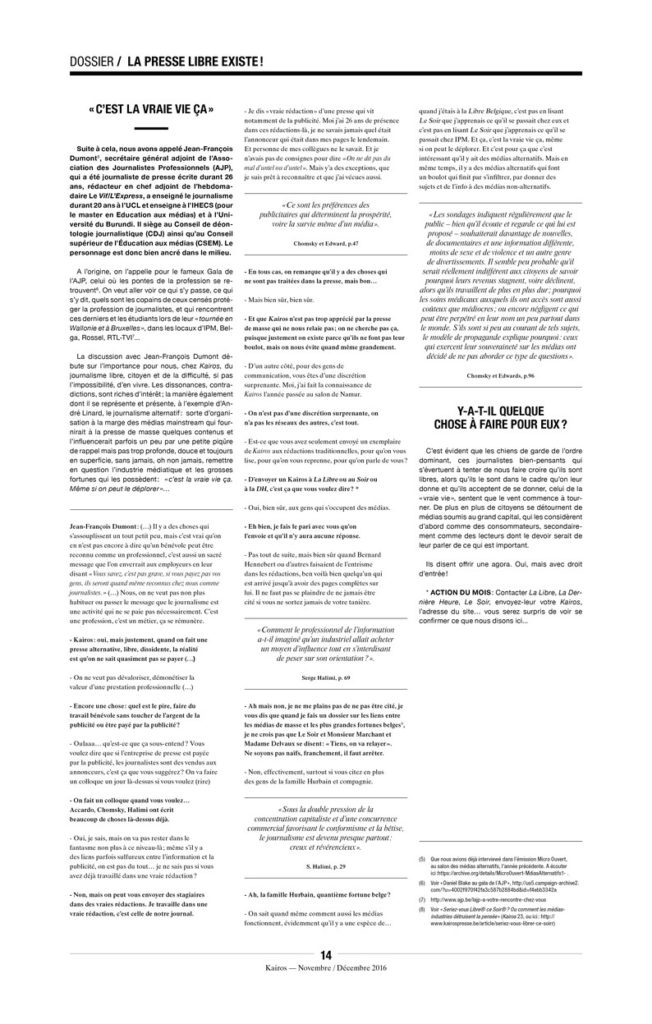 Si par un miracle les médias de masse capitalistes, demain devenaient libres, indépendants des pouvoirs politiques et économiques, le peuple pourrait enfin se forger une représentation sur le monde fondée sur la réalité, ce qui pourrait peut-être mener à des changements majeurs. Et nous pensons que ces changements pourraient avoir lieu rapidement.