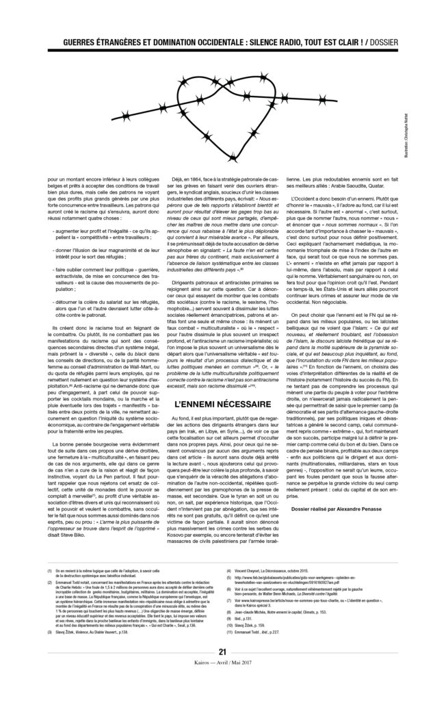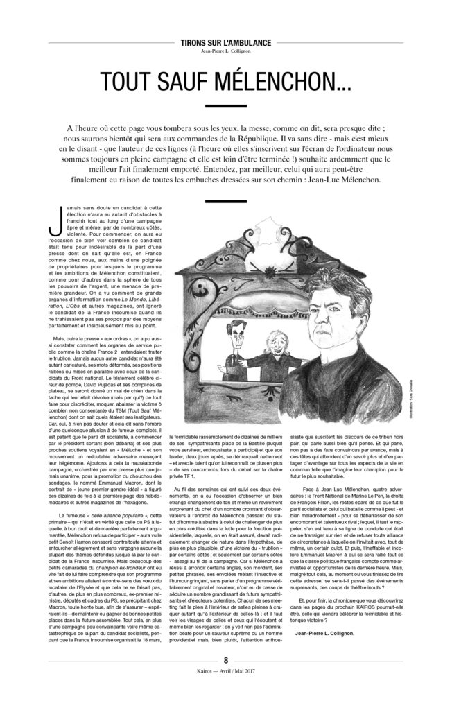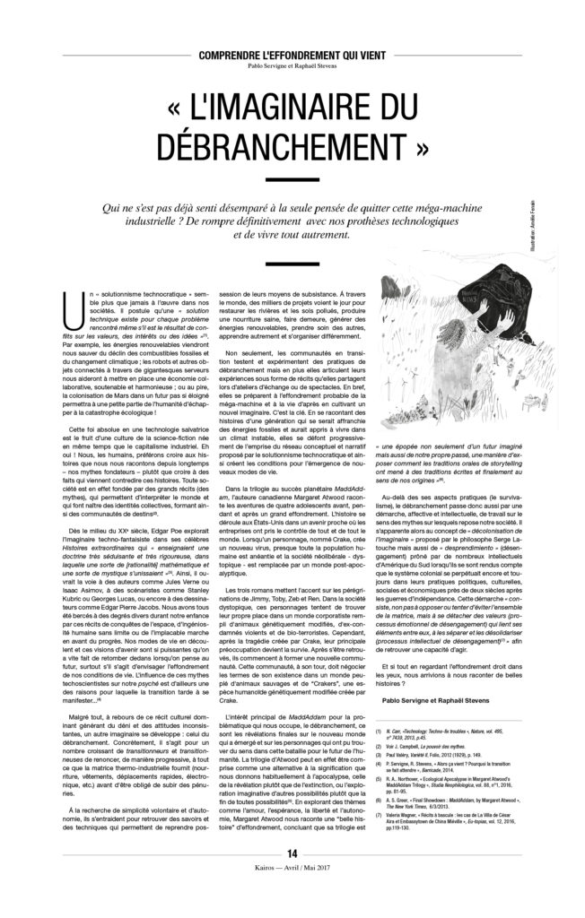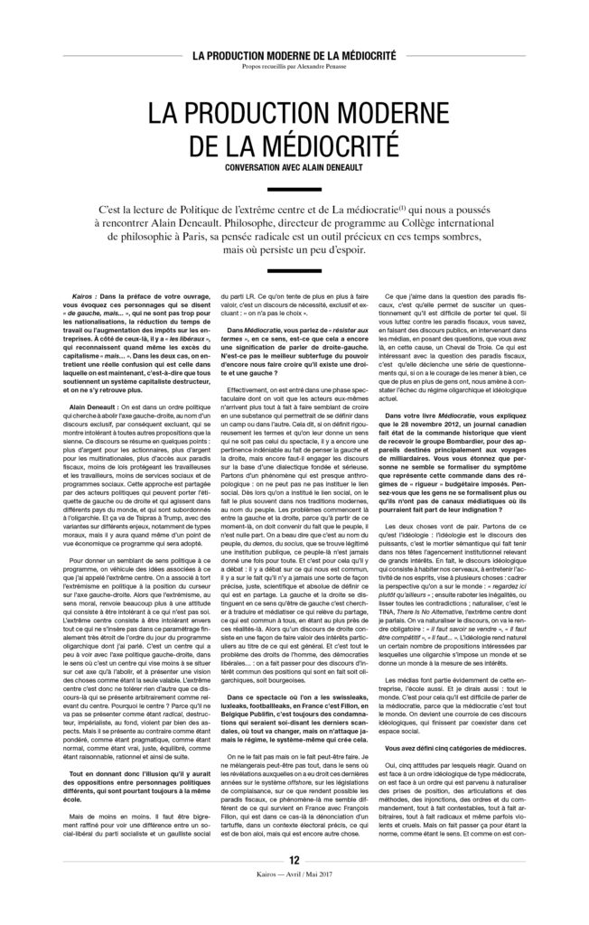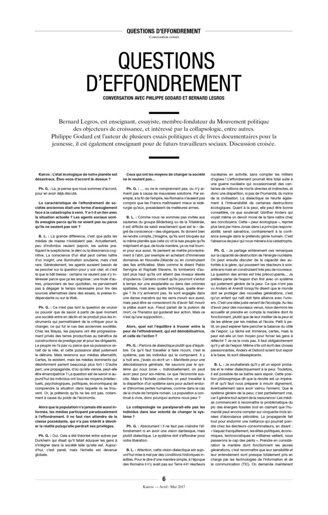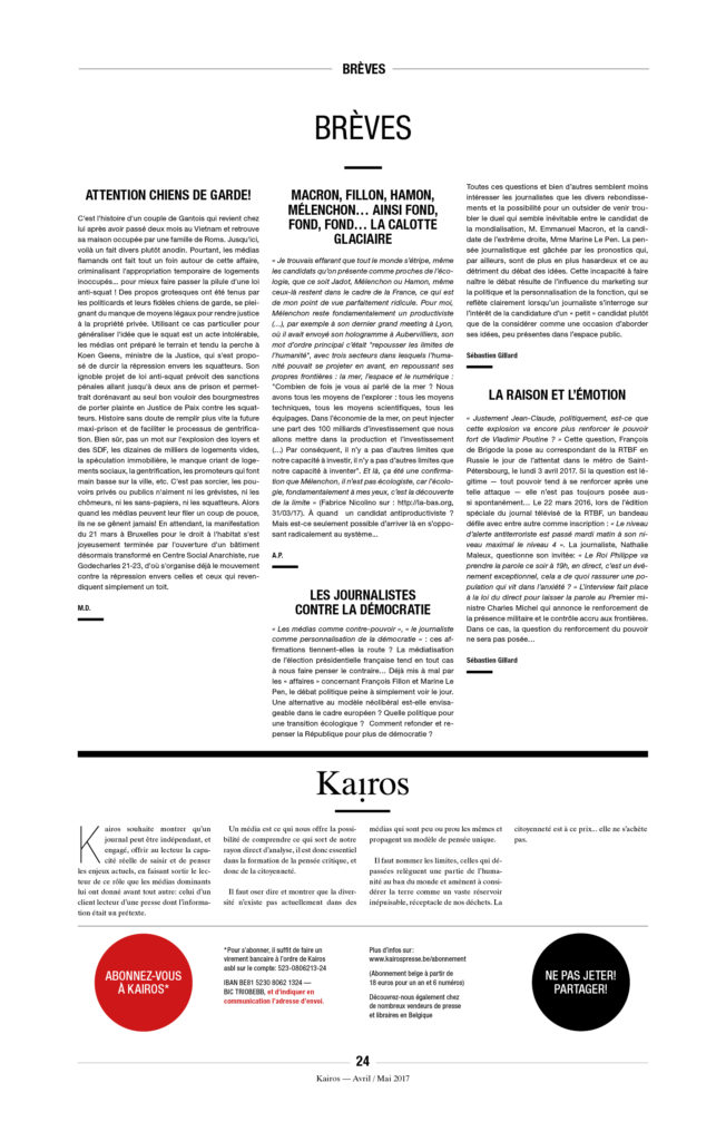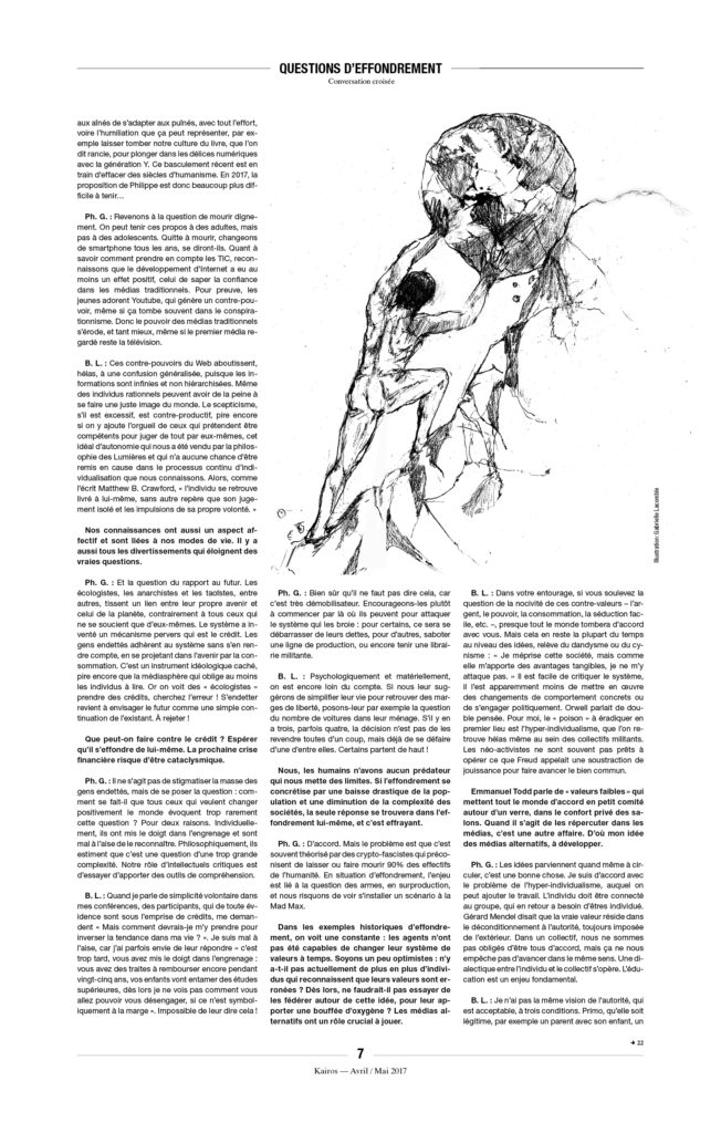 Enfin, une précision, car on ne sait jamais : À Kairos nous détestons l’extrême droite et ne voulons pas la voir arriver au pouvoir. Mais il n’y a pas de raison de s’accrocher, avec enthousiasme ou avec l’énergie du désespoir, à « notre » démocratie libérale de marché, entrée dans sa phase terminale. L’équation est pourtant simple : ni MacWorld, ni djihad, ni néo-fascisme. C’est à la fois simple à constater et très compliqué à mettre en œuvre.
