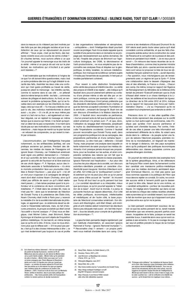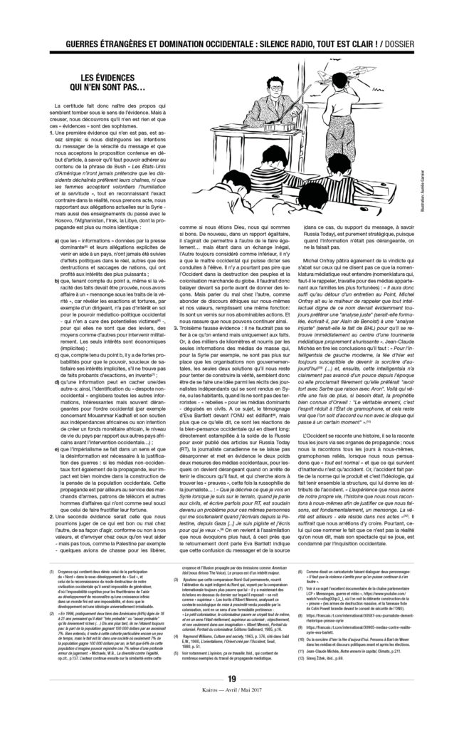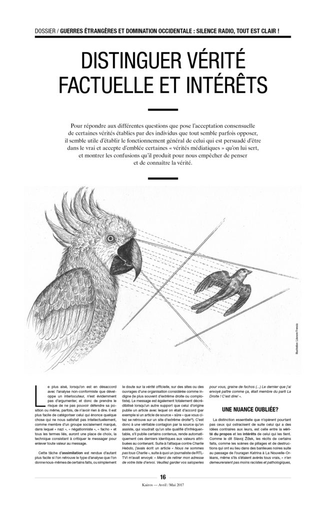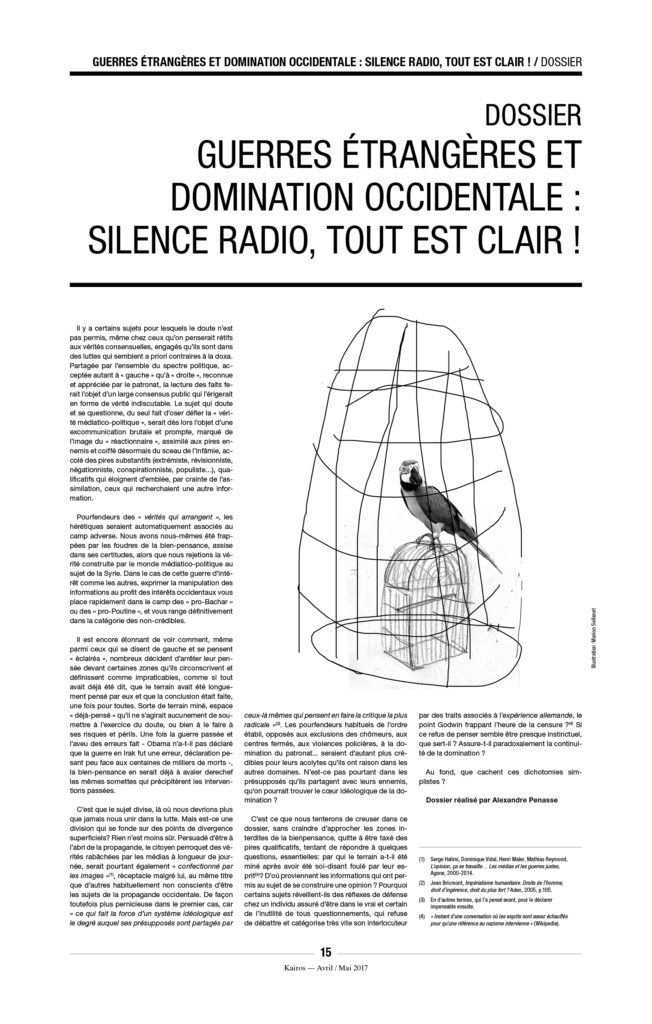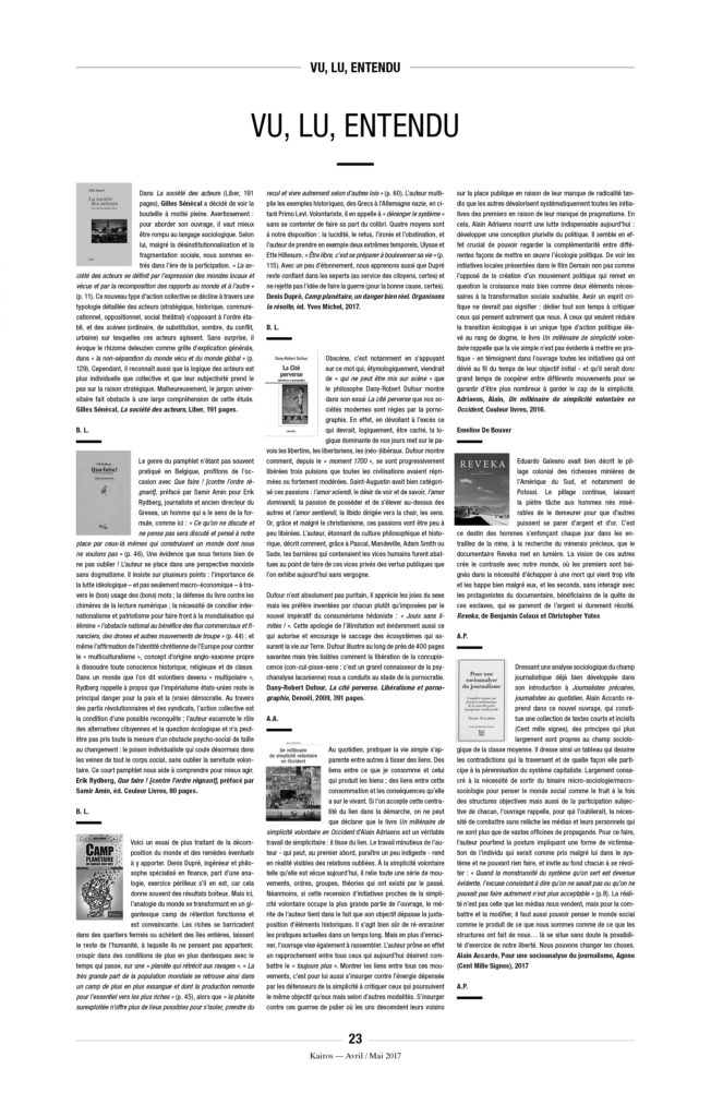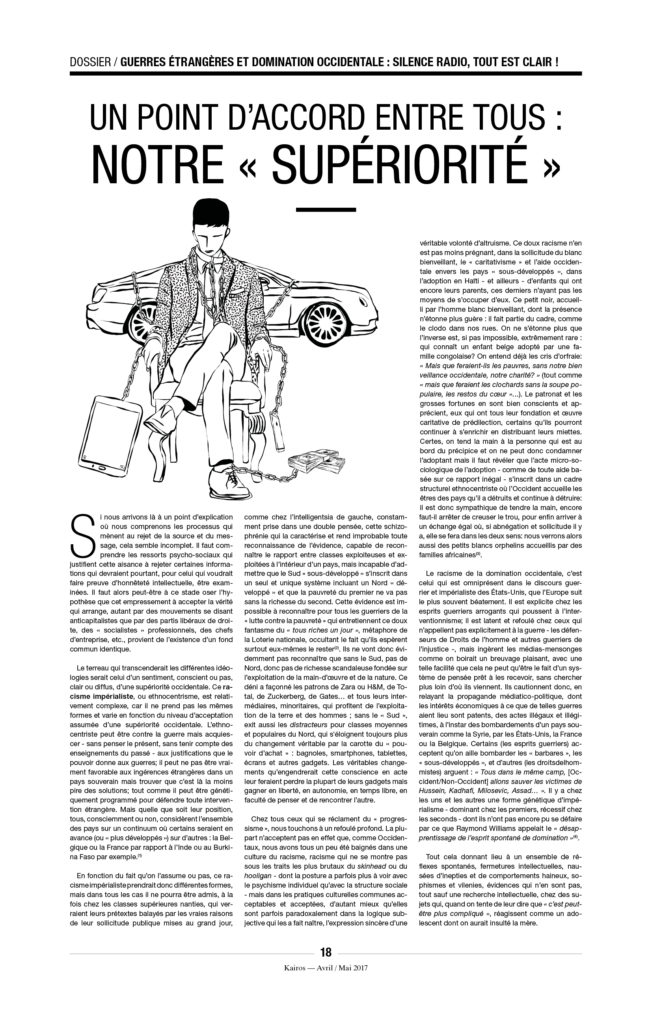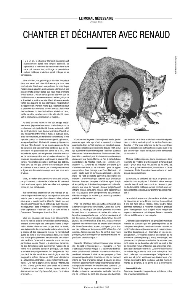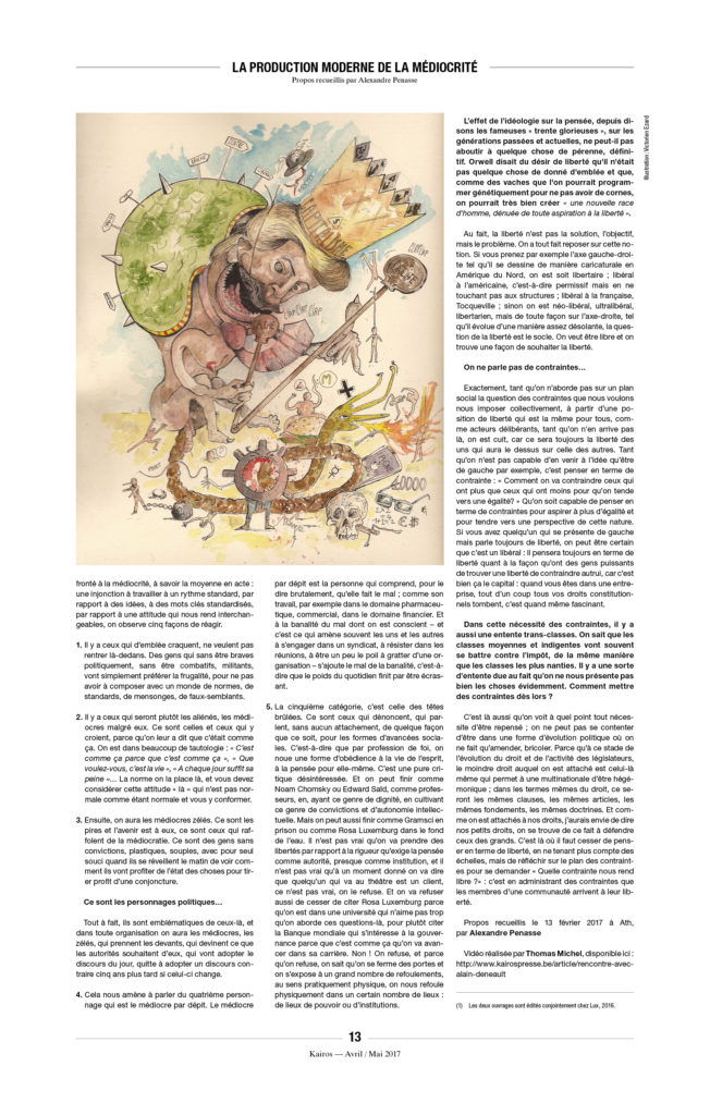 Enfin, une précision, car on ne sait jamais : À Kairos nous détestons l’extrême droite et ne voulons pas la voir arriver au pouvoir. Mais il n’y a pas de raison de s’accrocher, avec enthousiasme ou avec l’énergie du désespoir, à « notre » démocratie libérale de marché, entrée dans sa phase terminale. L’équation est pourtant simple : ni MacWorld, ni djihad, ni néo-fascisme. C’est à la fois simple à constater et très compliqué à mettre en œuvre.