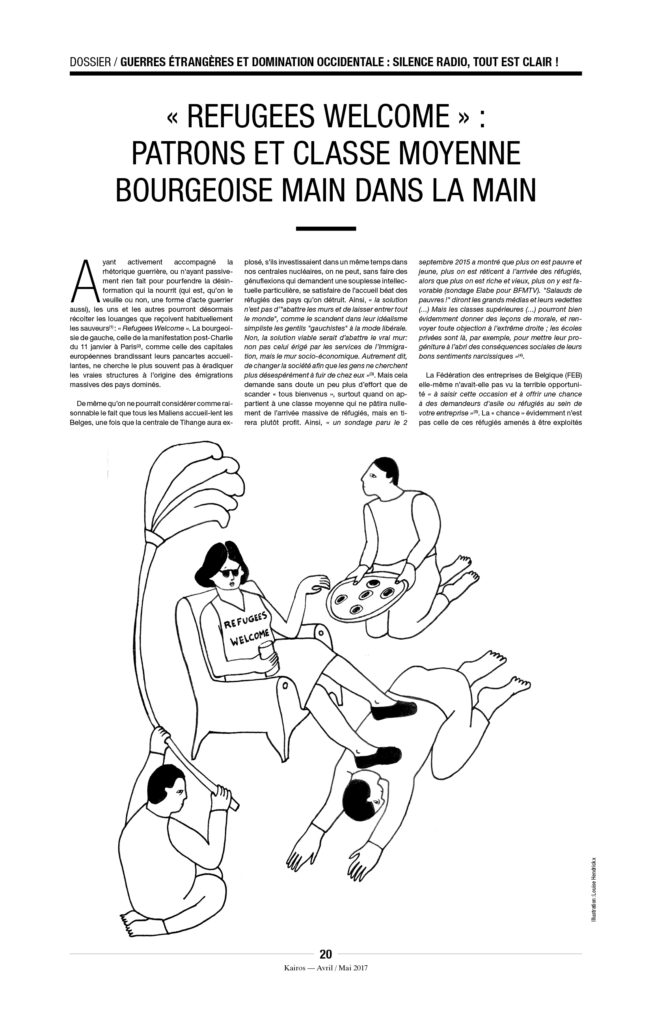 – « Chez nous[2] remontre les fondements d’un programme qui manipule les sentiments et embrigade des gens désemparés, réexpose une entreprise de communication et de marketing bien rôdée ». Ce « programme » décrit ici ressemble étrangement à celui… du néolibéralisme. Mais ça, B. Delvaux ne le « voit » pas.