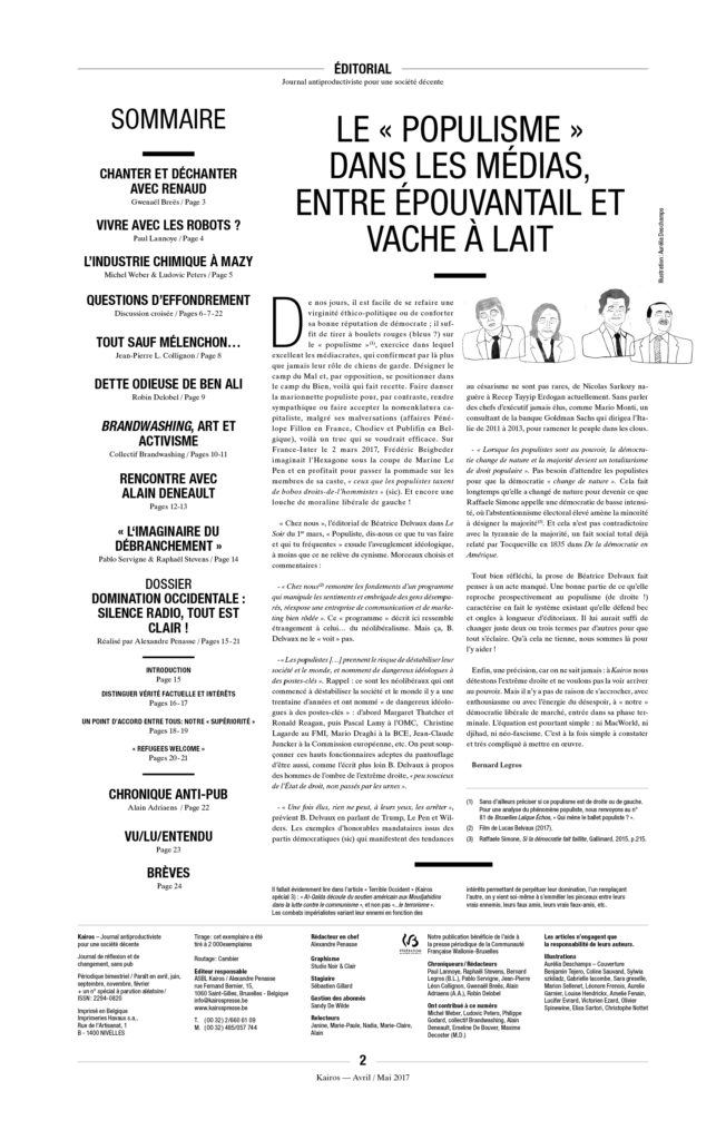 De nos jours, il est facile de se refaire une virginité éthico-politique ou de conforter sa bonne réputation de démocrate ; il suffit de tirer à boulets rouges (bleus ?) sur le « populisme »[1], exercice dans lequel excellent les médiacrates, qui confirment par là plus que jamais leur rôle de chiens de garde. Désigner le camp du Mal et, par opposition, se positionner dans le camp du Bien, voilà qui fait recette. Faire danser la marionnette populiste pour, par contraste, rendre sympathique ou faire accepter la nomenklatura capitaliste, malgré ses malversations (affaires Pénélope Fillon en France, Chodiev et Publifin en Belgique), voilà un truc qui se voudrait efficace. Sur France-Inter le 2 mars 2017, Frédéric Beigbeder imaginait l’Hexagone sous la coupe de Marine Le Pen et en profitait pour passer la pommade sur les membres de sa caste, « ceux que les populistes taxent de bobos droits-de-l’hommistes » (sic). Et encore une louche de moraline libérale de gauche !