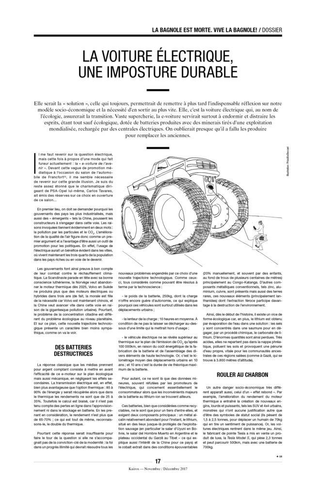 Or, rien ne viendra remplacer le rendement énergétique du pétrole : il n’y aura pas de voitures électriques qui pourront perpétuer la colonisation planétaire comme le fait la voiture à combustion aujourd’hui ; pas d’avions qui pourront voler sans polluer massivement ; pas de centrales nucléaires sans risques ; pas de mondialisation heureuse où l’on n’équilibrerait pas les stagnations salariales au Nord par une surexploitation de la force de travail au Sud et une destruction de leur lieu de vie ; pas de possibilité de vie décente dans un milieu où existent des multinationales.