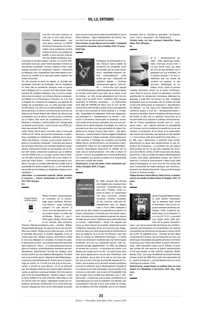 Avant de penser à notre émancipation, parlons d’abord de notre responsabilité, mais pas n’importe comment : elle ne regardera pas le nombril – laissons cela aux dévots du « développement personnel » –, mais la collectivité ; elle sera associée à la décence commune et à la vergogne. Dans un ouvrage posthume publié en 1994, Christopher Lasch écrivait : « La philosophie politique du XXIe siècle devra donner plus de poids à la communauté qu’au droit de décider personnellement. Elle devra mettre l’accent sur les responsabilités plutôt que les droits. Elle devra trouver une meilleure expression de la communauté que l’assistanat d’État. Elle devra limiter le champ du marché et le pouvoir des grandes compagnies sans les remplacer par une bureaucratie étatique centralisée. »