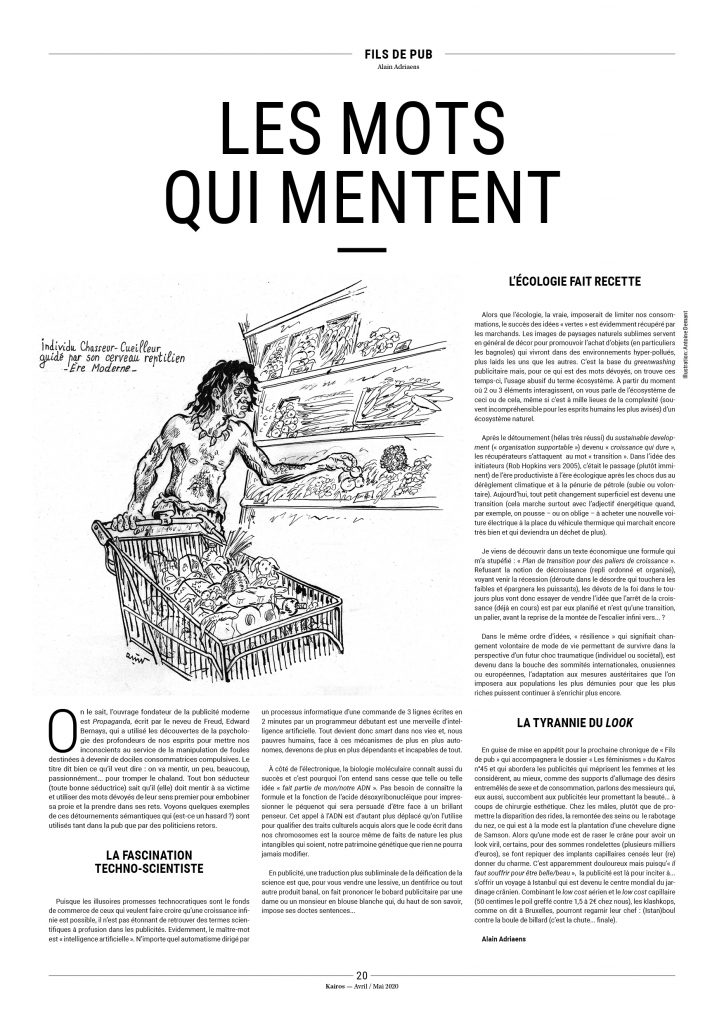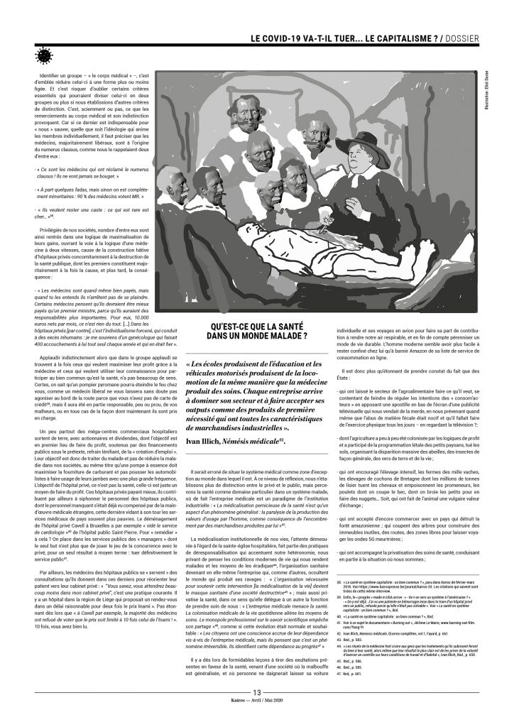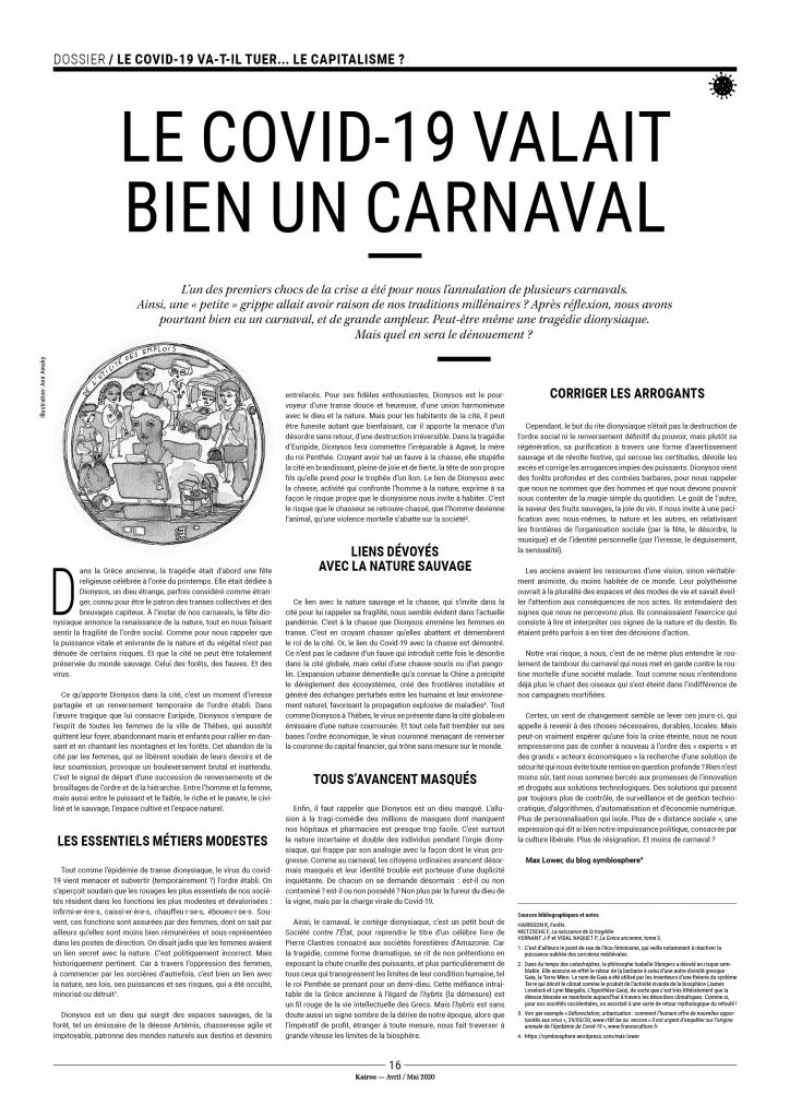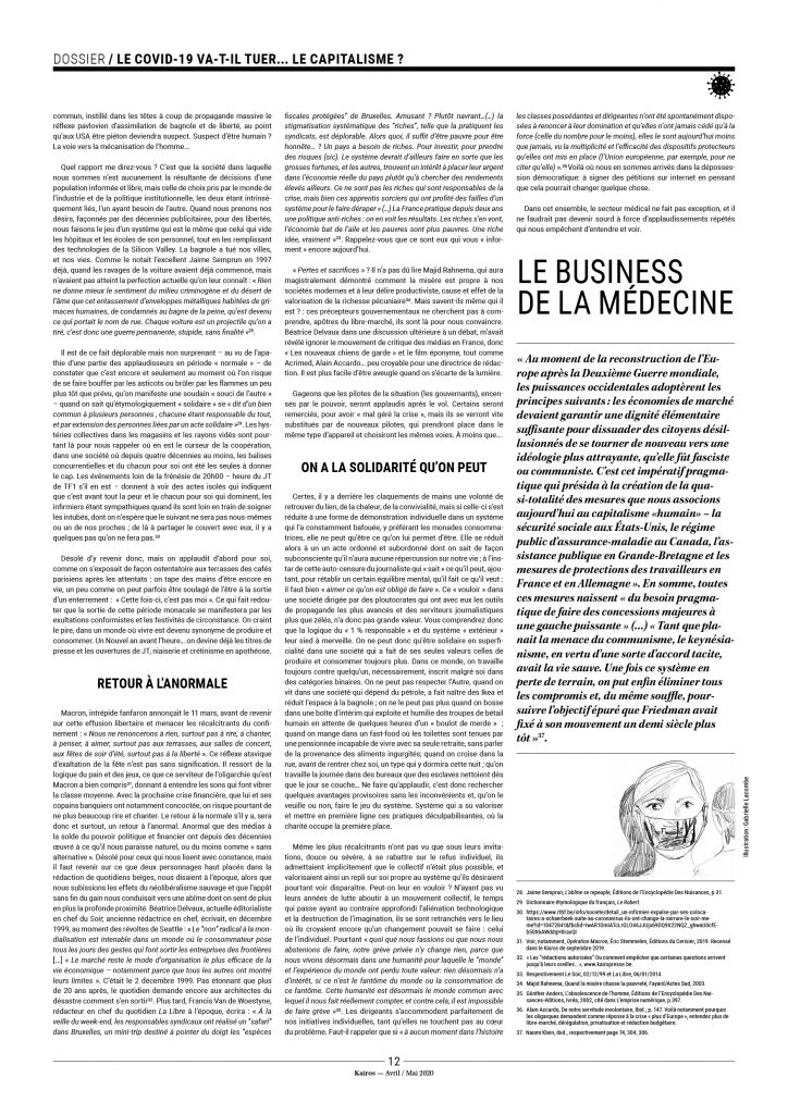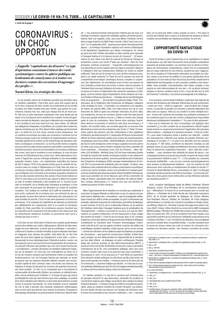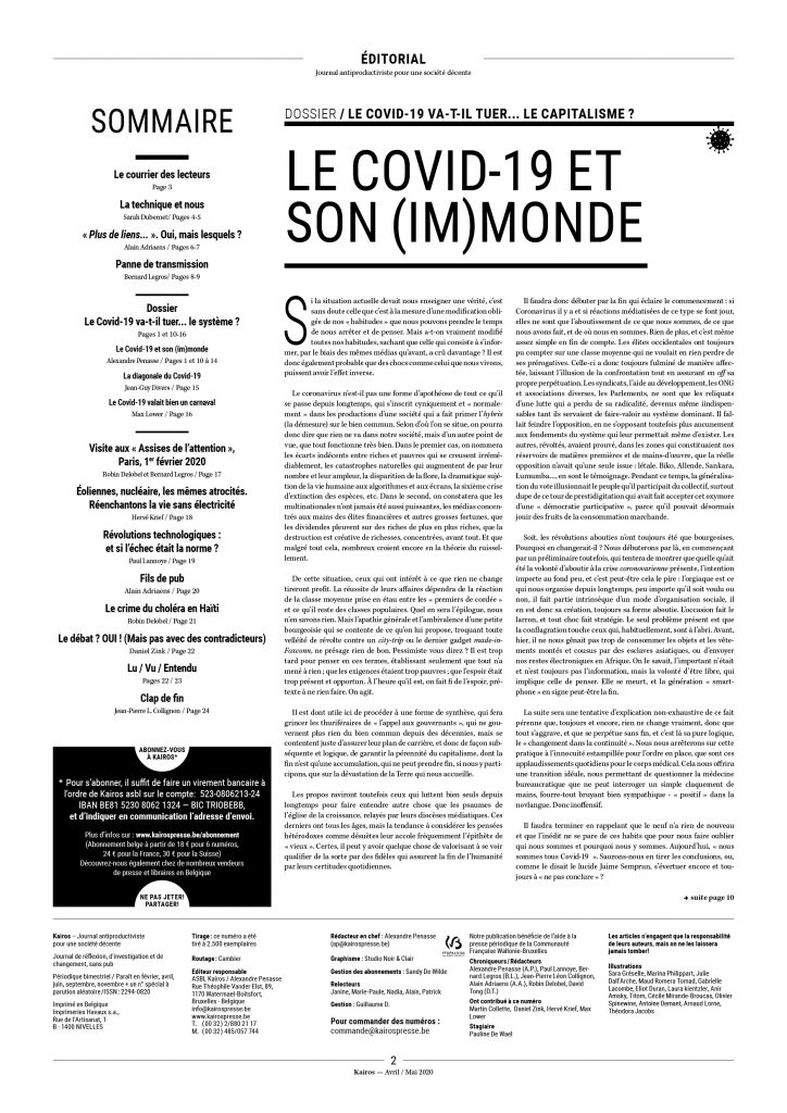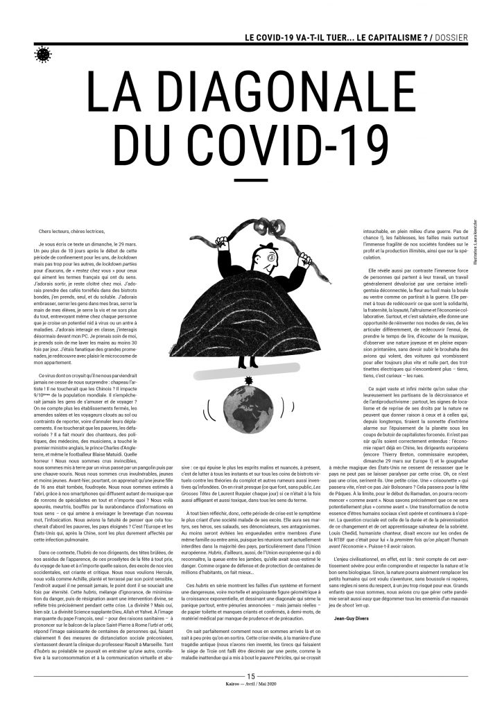Le coronavirus n’est-il pas une forme d’apothéose de tout ce qu’il se passe depuis longtemps, qui s’inscrit cyniquement et « normalement » dans les productions d’une société qui a fait primer l’hybris (la démesure) sur le bien commun. Selon d’où l’on se situe, on pourra donc dire que rien ne va dans notre société, mais d’un autre point de vue, que tout fonctionne très bien. Dans le premier cas, on nommera les écarts indécents entre riches et pauvres qui se creusent irrémédiablement, les catastrophes naturelles qui augmentent de par leur nombre et leur ampleur, la disparition de la flore, la dramatique sujétion de la vie humaine aux algorithmes et aux écrans, la sixième crise d’extinction des espèces, etc. Dans le second, on constatera que les multinationales n’ont jamais été aussi puissantes, les médias concentrés aux mains des élites financières et autres grosses fortunes, que les dividendes pleuvent sur des riches de plus en plus riches, que la destruction est créative de richesses, concentrées, avant tout. Et que malgré tout cela, nombreux croient encore en la théorie du ruissellement.