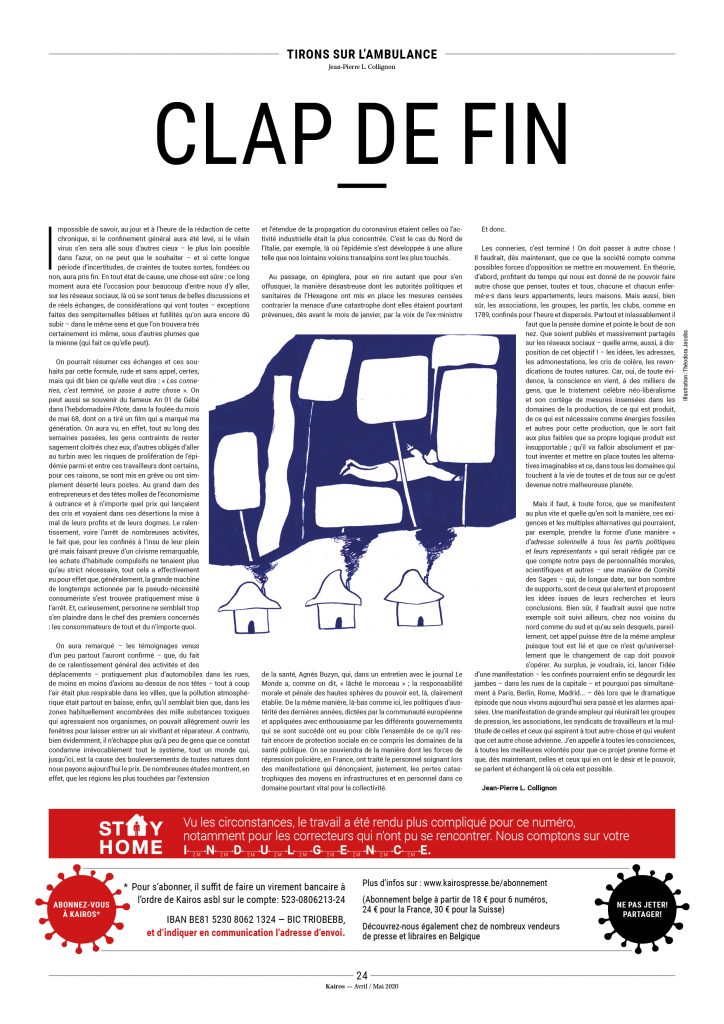 La suite sera une tentative d’explication non-exhaustive de ce fait pérenne que, toujours et encore, rien ne change vraiment, donc que tout s’aggrave, et que se perpétue sans fin, et c’est là sa pure logique, le « changement dans la continuité ». Nous nous arrêterons sur cette pratique à l’innocuité estampillée pour l’ordre en place, que sont ces applaudissements quotidiens pour le corps médical. Cela nous offrira une transition idéale, nous permettant de questionner la médecine bureaucratique que ne peut interroger un simple claquement de mains, fourre-tout bruyant bien sympathique « positif » dans la novlangue. Donc inoffensif.