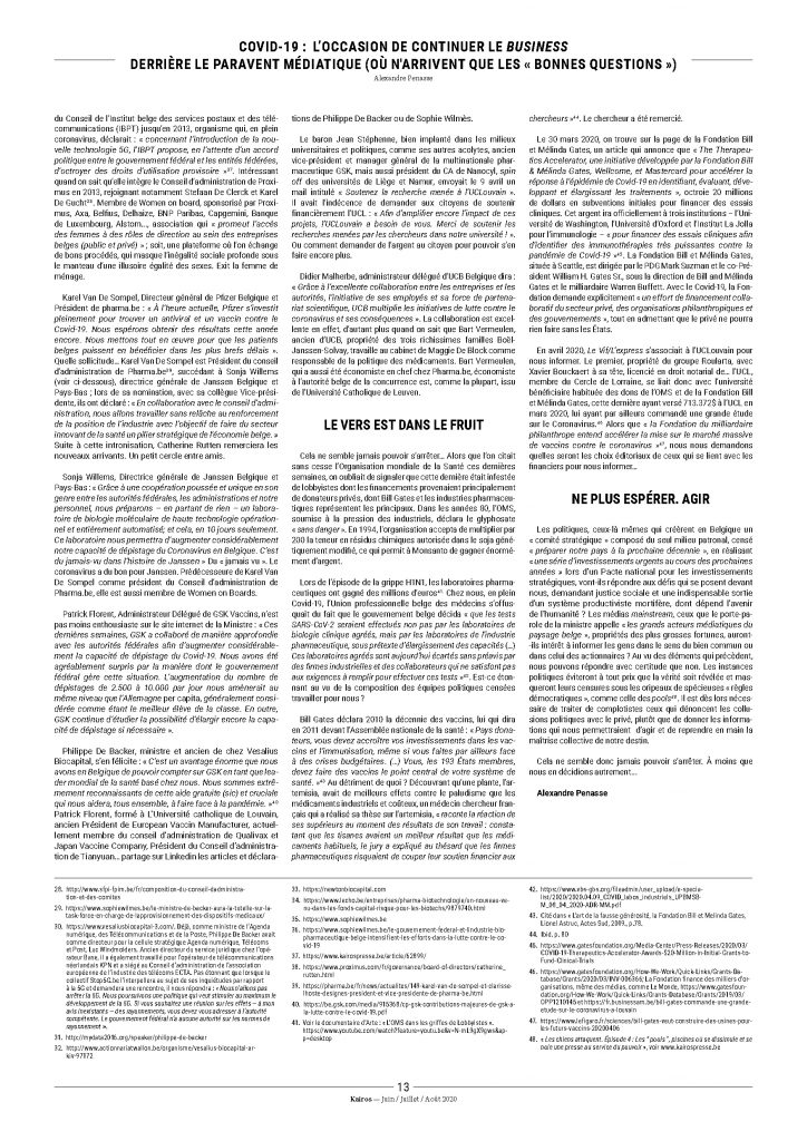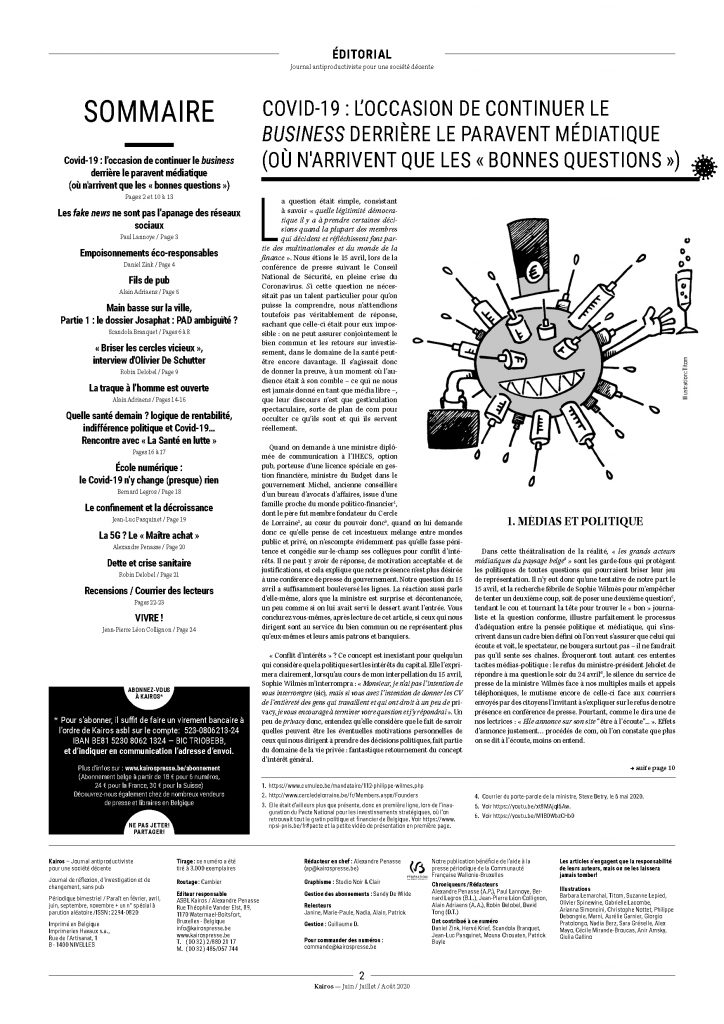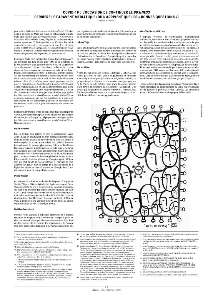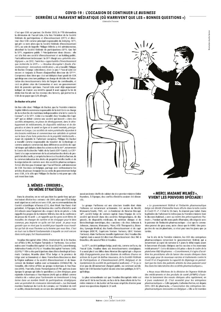 « Conflit d’intérêts » ? Ce concept est inexistant pour quelqu’un qui considère que la politique sert les intérêts du capital. Elle l’exprimera clairement, lorsqu’au cours de mon interpellation du 15 avril, Sophie Wilmès m’interrompra : « Monsieur, je n’ai pas l’intention de vous interrompre (sic), mais si vous avez l’intention de donner les CV de l’entièreté des gens qui travaillent et qui ont droit à un peu de privacy, je vous encourage à terminer votre question et j’y répondrai ». Un peu de privacy donc, entendez qu’elle considère que le fait de savoir quelles peuvent être les éventuelles motivations personnelles de ceux qui nous dirigent à prendre des décisions politiques, fait partie du domaine de la vie privée : fantastique retournement du concept d’intérêt général.