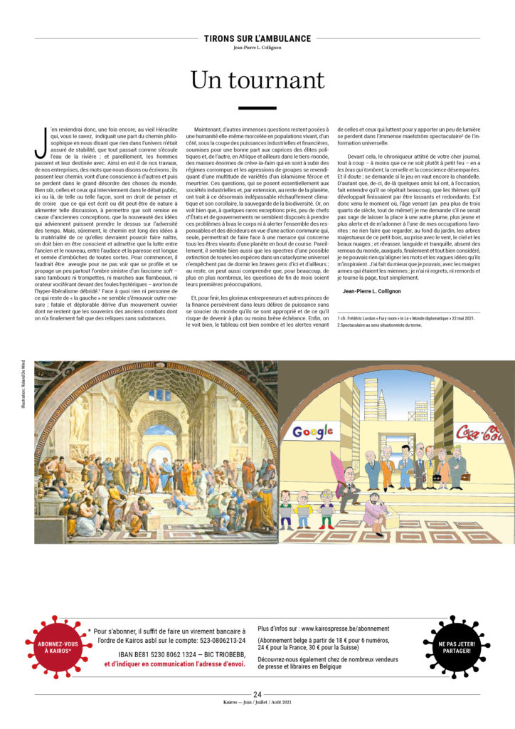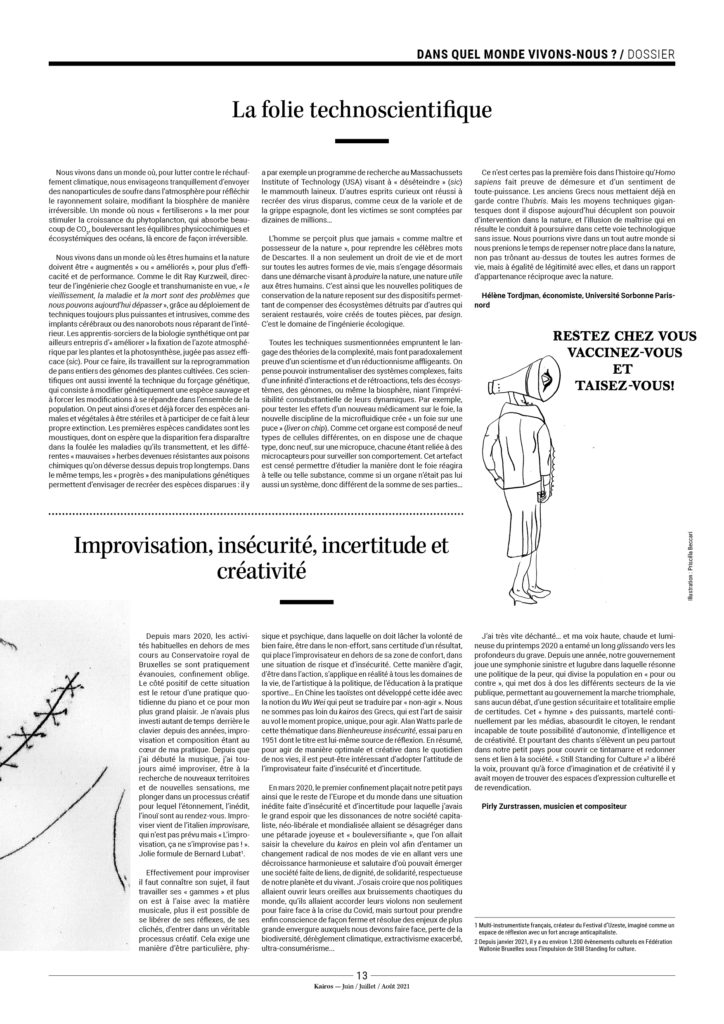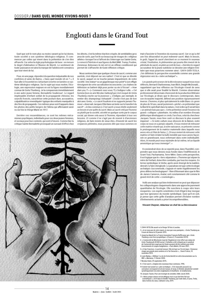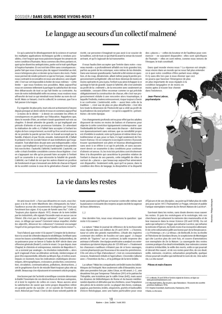 Ces technocrates qui, quand l’appartement brûle, installent en toute précipitation la 5G, l’éclairage led sur les autouroutes, les parcs d’éoliennes … plutôt que d’appeler les pompiers, sauver ce qu’il reste, s’asseoir enfin et réfléchir au monde à reconstruire. Car c’est le moment, le kairos. Il n’y en aura plus d’autre.