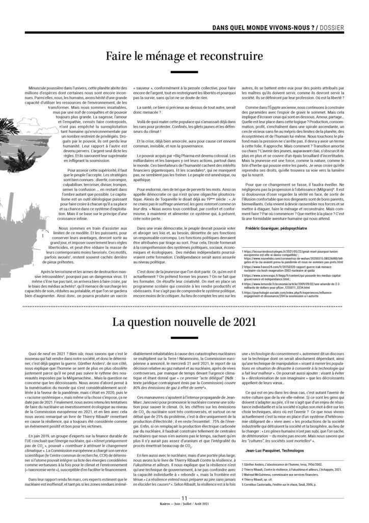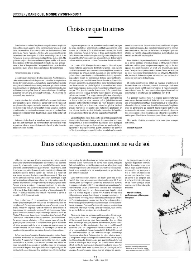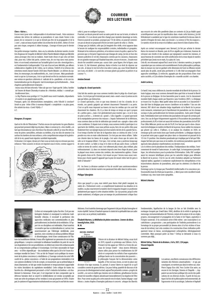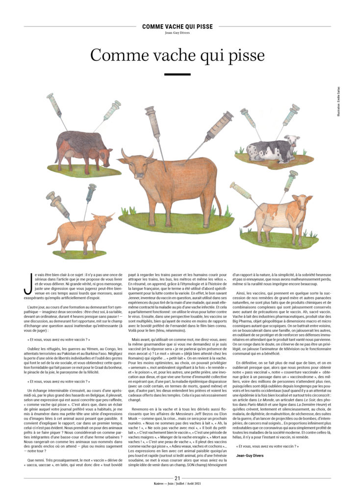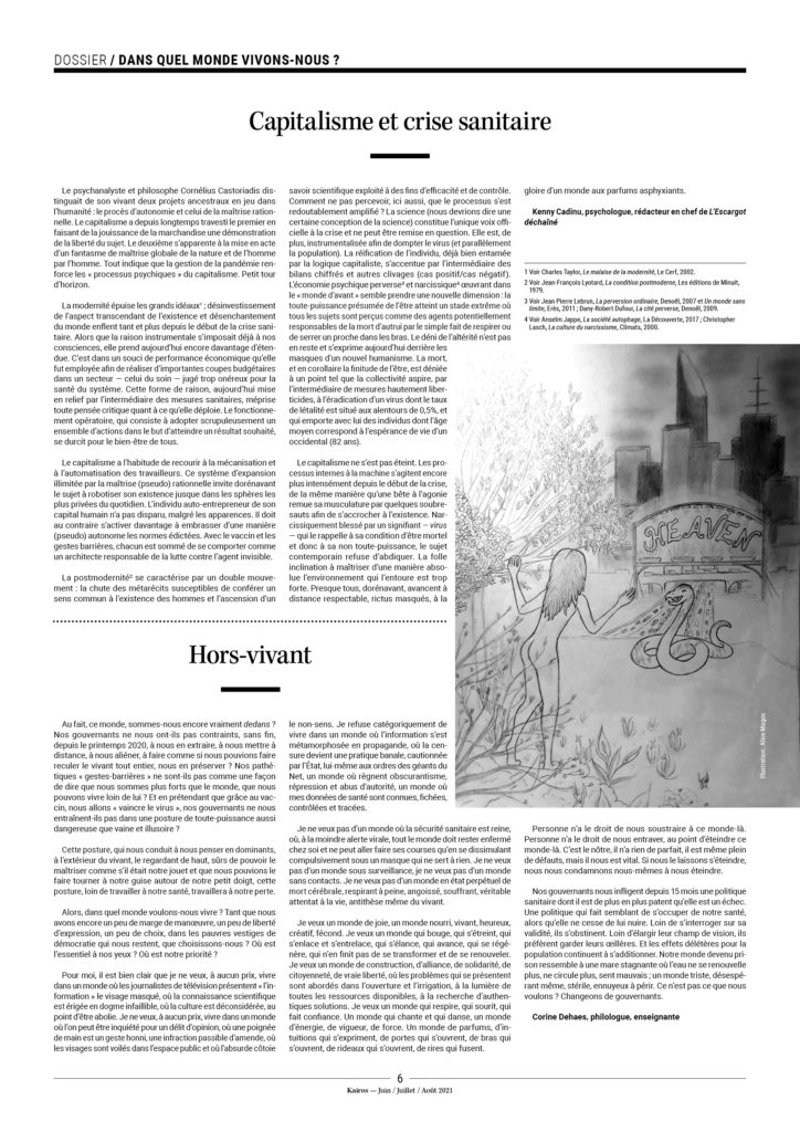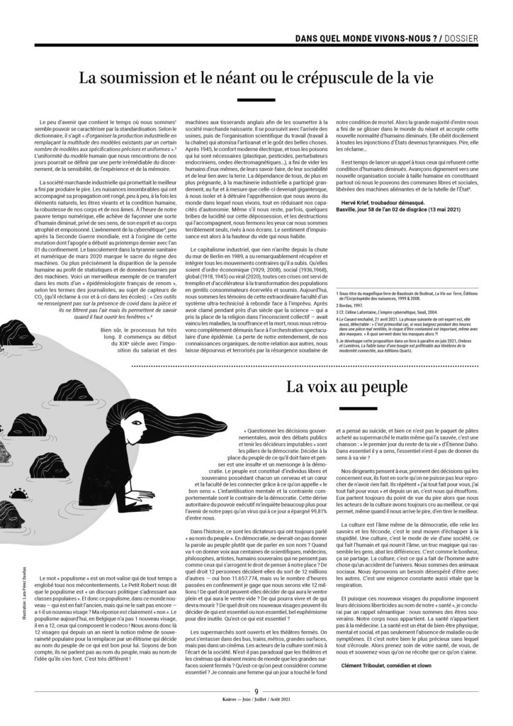 fois : il nous sort par tous les pores, nous empêchant de penser, de nous toucher, nous rassembler. Il ne faudrait toutefois pas qu’il serve d’exutoire à une population à bout de nerfs, car ce pauvre virus n’y peut rien au fond, au contraire de ce que médias et politiques en ont fait[1]. Les hommes, ou l’histoire, les jugeront.