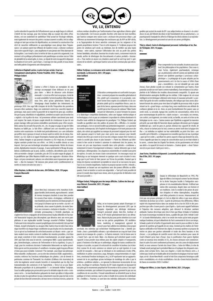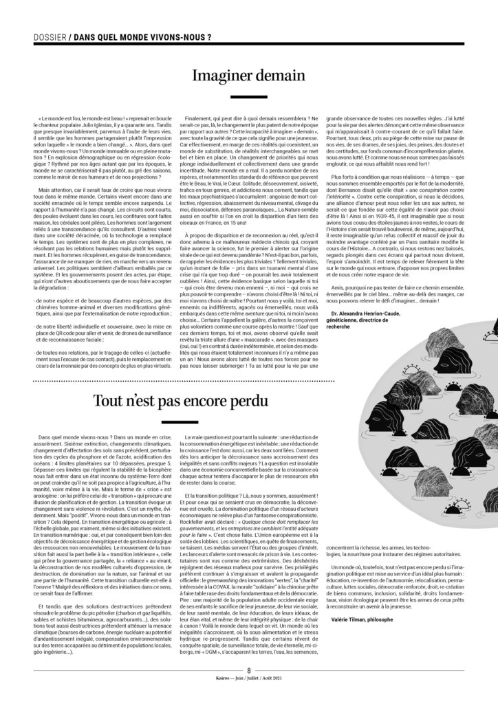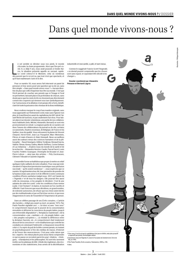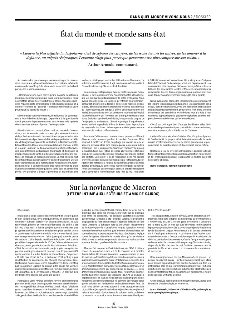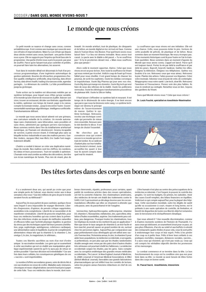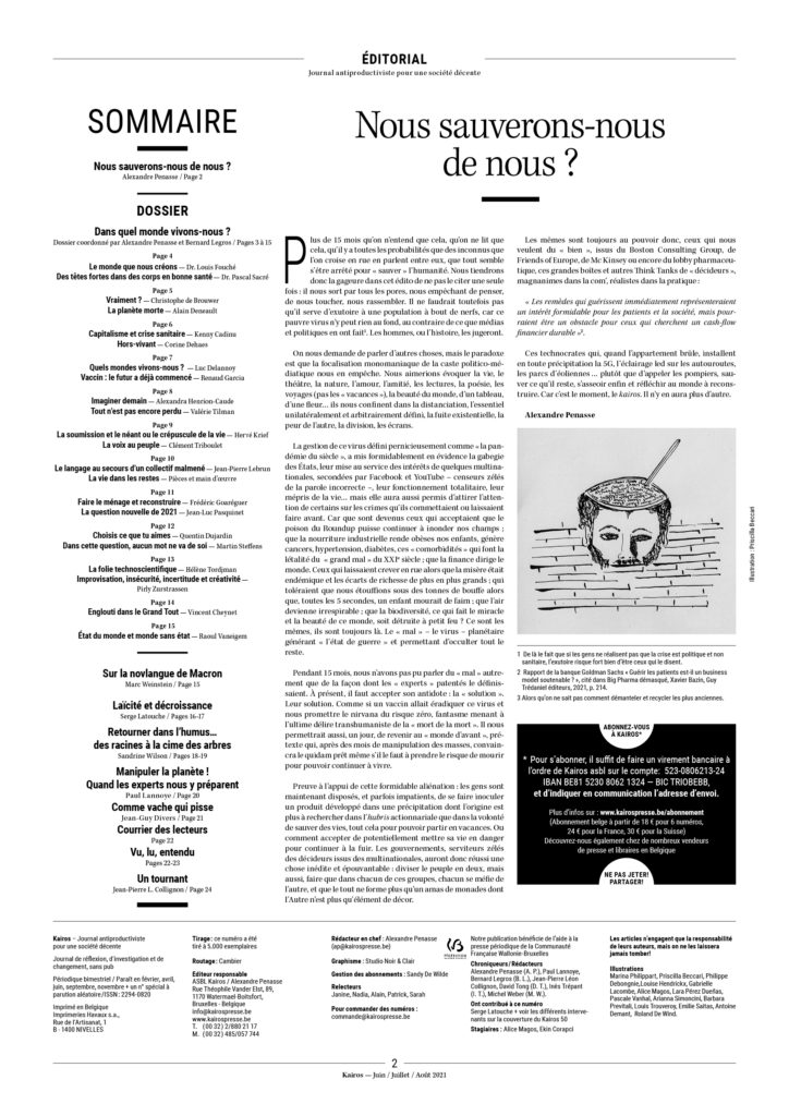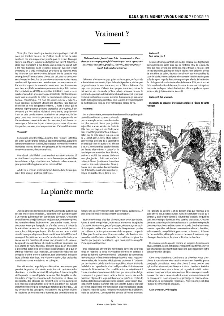 La gestion de ce virus défini pernicieusement comme « la pandémie du siècle », a mis formidablement en évidence la gabegie des États, leur mise au service des intérêts de quelques multinationales, secondées par Facebook et YouTube – censeurs zélés de la parole incorrecte –, leur fonctionnement totalitaire, leur mépris de la vie… mais elle aura aussi permis d’attirer l’attention de certains sur les crimes qu’ils commettaient ou laissaient faire avant. Car que sont devenus ceux qui acceptaient que le poison du Roundup puisse continuer à inonder nos champs ; que la nourriture industrielle rende obèses nos enfants, génère cancers, hypertension, diabètes, ces « comorbidités » qui font la létalité du « grand mal » du XXIe siècle ; que la finance dirige le monde. Ceux qui laissaient crever en rue alors que la misère était endémique et les écarts de richesse de plus en plus grands ; qui toléraient que nous étouffions sous des tonnes de bouffe alors que, toutes les 5 secondes, un enfant mourait de faim ; que l’air devienne irrespirable ; que la biodiversité, ce qui fait le miracle et la beauté de ce monde, soit détruite à petit feu ? Ce sont les mêmes, ils sont toujours là. Le « mal » – le virus – planétaire générant « l’état de guerre » et permettant d’occulter tout le reste.