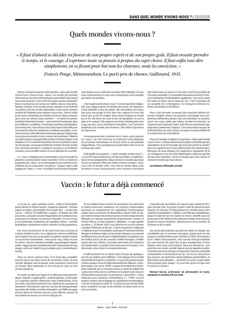 On nous demande de parler d’autres choses, mais le paradoxe est que la focalisation monomaniaque de la caste politico-médiatique nous en empêche. Nous aimerions évoquer la vie, le théâtre, la nature, l’amour, l’amitié, les lectures, la poésie, les voyages (pas les « vacances »), la beauté du monde, d’un tableau, d’une fleur… ils nous confinent dans la distanciation, l’essentiel unilatéralement et arbitrairement défini, la fuite existentielle, la peur de l’autre, la division, les écrans.