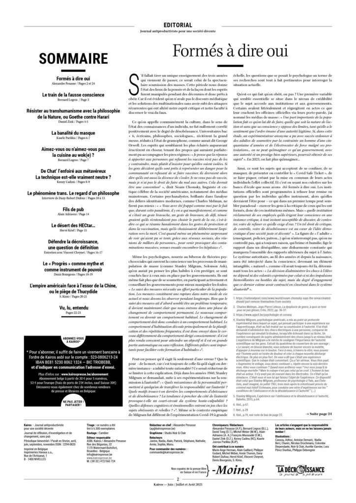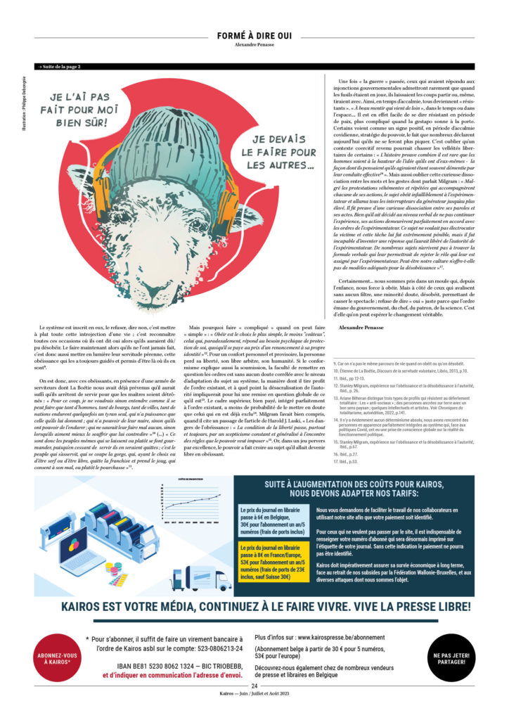 Certainement… nous sommes pris dans un moule qui, depuis l’enfance, nous force à obéir. Mais à côté de ceux qui avalisent sans aucun filtre, une minorité doute, désobéit, permettant de casser le spectacle ; refuse de dire « oui » juste parce que l’ordre émane du gouvernement, du chef, du patron, de la science. C’est d’elle qu’on peut espérer le changement véritable.