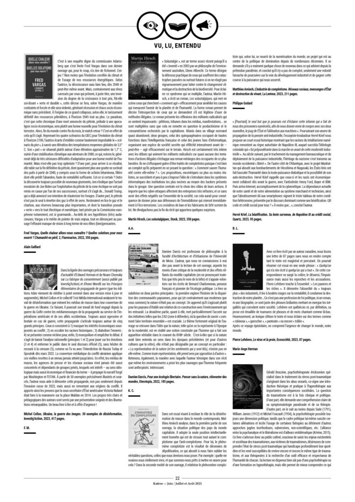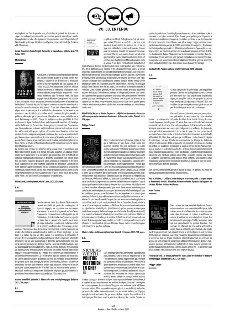 13. Ariane Bilheran distingue trois types de profils qui résistent au déferlement totalitaire : Les « anti-sociaux » ; des personnes ancrées sur terre avec un bon sens paysan ; quelques intellectuels et artistes. Voir Chroniques du totalitarisme, autoédition, 2022, p.141.