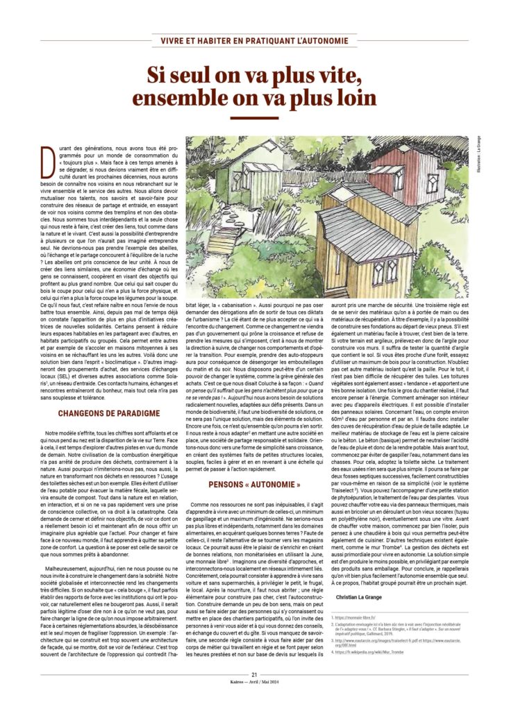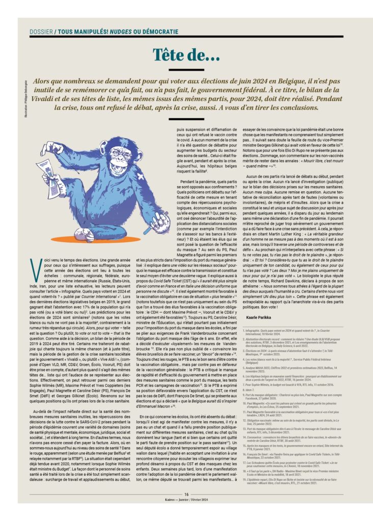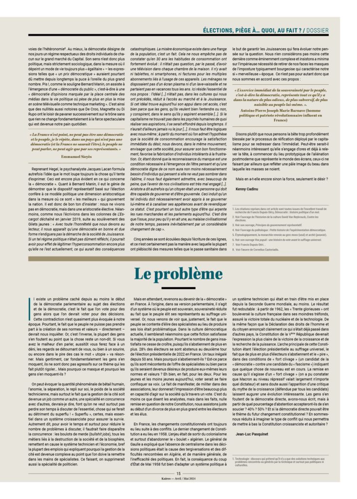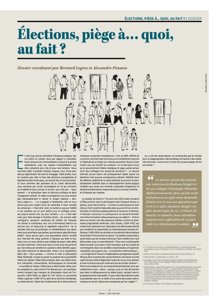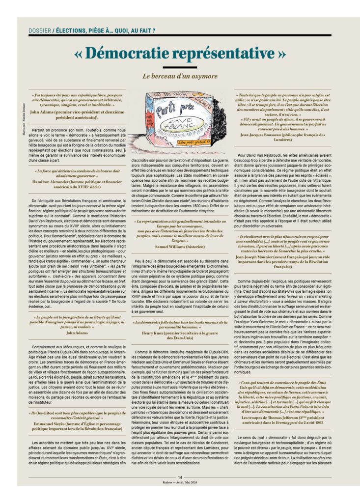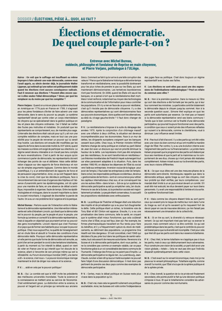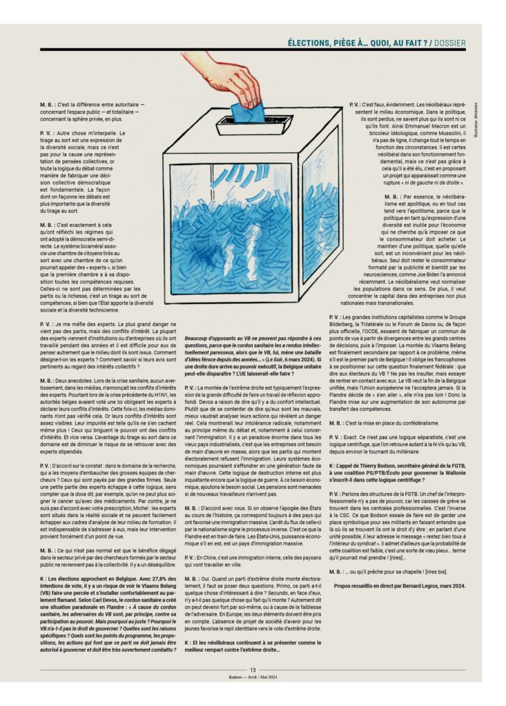 – Les gens n’ont que très peu d’incidence sur les choix importants de société. On peut penser que des individus informés qui devraient en toute connaissance de cause prendre une décision sur le génocide à Gaza, la guerre en Ukraine, les salaires du personnel politique, la généralisation de la voiture électrique, les paradis fiscaux, les grands projets immobiliers, le référendum… iraient dans un tout autre sens que celui des gouvernements.