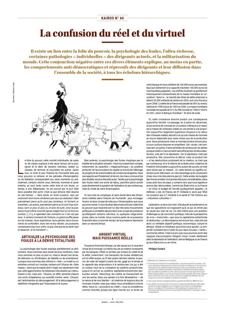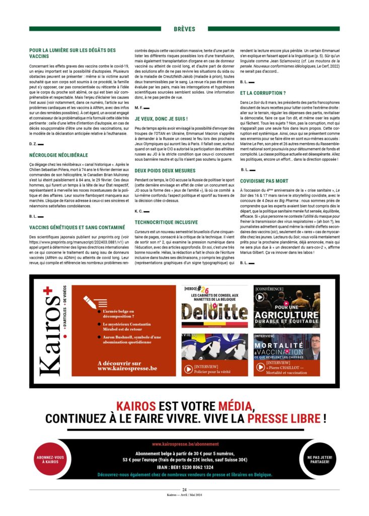 – Les gouvernements veulent, via leur service de propagande, instaurer la terreur dans les esprits, terreur dont le premier objectif est d’empêcher que s’exprime publiquement un narratif s’opposant à celui qu’ils propagent. Si certains discours subversifs se propagent toutefois – comme celui de Kairos –, ils usent des armes traditionnelles : censure, ostracisme, mesures de rétorsion économique.