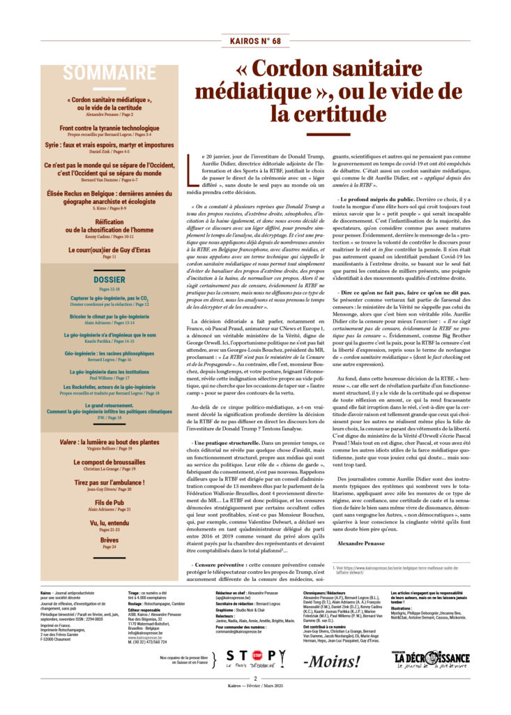 - Censure préventive : cette censure préventive censée protéger le téléspectateur contre les propos de Trump, n’est aucunement différente de la censure des médecins, soignants, scientifiques et autres qui ne pensaient pas comme le gouvernement en temps de covid-19 et ont été empêchés de débattre. C’était aussi un cordon sanitaire médiatique, qui comme le dit Aurélie Didier, est « appliqué depuis des années à la RTBF ».