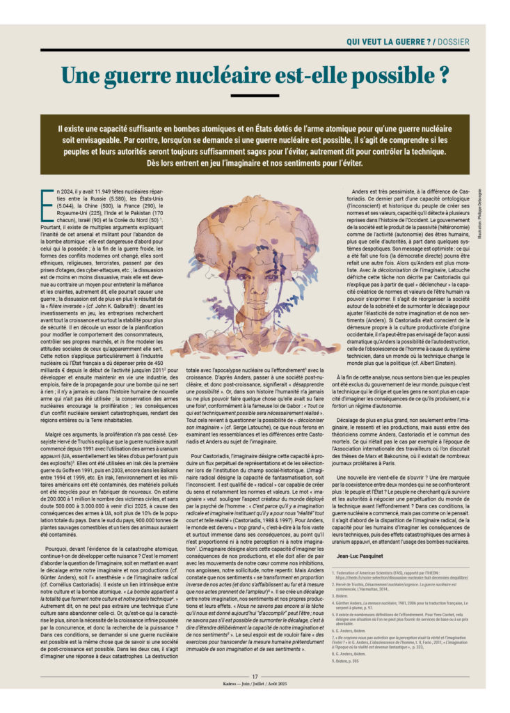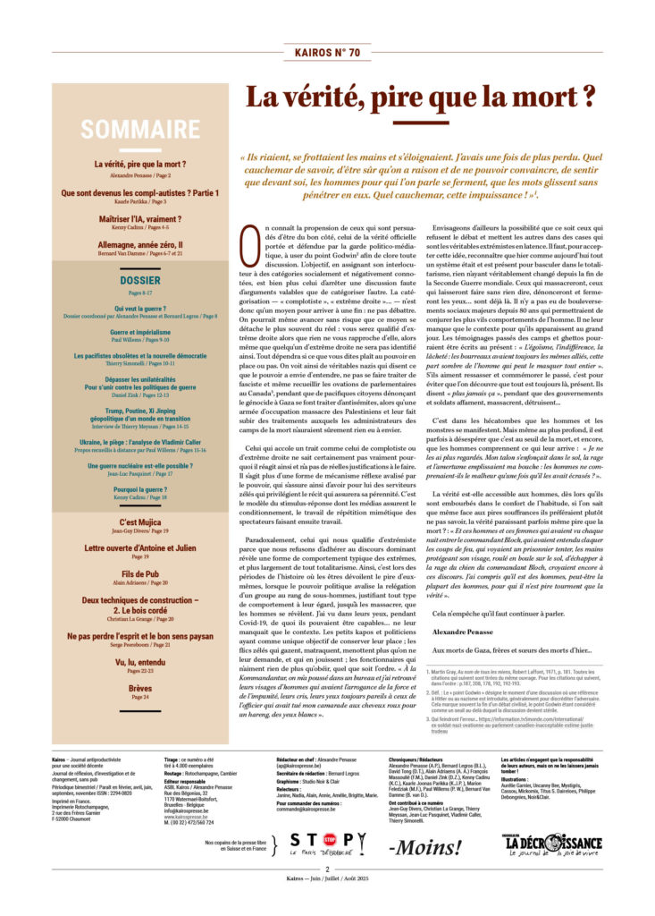 Envisageons d’ailleurs la possibilité que ce soit ceux qui refusent le débat et mettent les autres dans des cases qui sont les véritables extrémistes en latence. Il faut, pour accepter cette idée, reconnaître que hier comme aujourd’hui tout un système était et est présent pour basculer dans le totalitarisme, rien n’ayant véritablement changé depuis la fin de la Seconde Guerre mondiale. Ceux qui massacreront, ceux qui laisseront faire sans rien dire, dénonceront et fermeront les yeux… sont déjà là. Il n’y a pas eu de bouleversements sociaux majeurs depuis 80 ans qui permettraient de conjurer les plus vils comportements de l’homme. Il ne leur manque que le contexte pour qu’ils apparaissent au grand jour. Les témoignages passés des camps et ghettos pourraient être écrits au présent : « L’égoïsme, l’indifférence, la lâcheté : les bourreaux avaient toujours les mêmes alliés, cette part sombre de l’homme qui peut le masquer tout entier ». S’ils aiment ressasser et commémorer le passé, c’est pour éviter que l’on découvre que tout est toujours là, présent. Ils disent « plus jamais ça », pendant que des gouvernements et soldats affament, massacrent, détruisent…