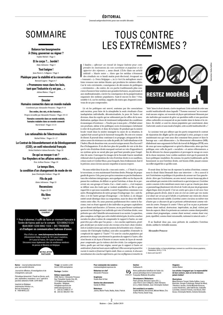 Il serait donc de bon ton de repenser la notion d’extrême, comme nous le disait Alain Deneault dans une interview : « On a associé à tort l’extrémisme en politique à la position du curseur sur l’axe gauche-droite. Alors que l’extrémisme, au sens moral, renvoie beaucoup plus à une attitude qui consiste à être intolérant à ce qui n’est pas soi. L’extrême centre consiste à être intolérant envers tout ce qui ne s’insère pas dans ce paramétrage finalement très étroit de l’ordre du jour du programme oligarchique dont j’ai parlé. C’est un centre qui a peu à voir avec l’axe politique gauche-droite, dans le sens où c’est un centre qui vise moins à se situer sur cet axe qu’à l’abolir, et à présenter une vision des choses comme étant la seule valable. L’extrême centre c’est donc ne tolérer rien d’autre que ce discours-là qui se présente arbitrairement comme relevant du centre. Pourquoi le centre ? Parce qu’il ne va pas se présenter comme étant radical, destructeur, impérialiste, au fond, violent par bien des aspects. Mais il se présente au contraire comme étant pondéré, comme étant pragmatique, comme étant normal, comme étant vrai, juste, équilibré, comme étant raisonnable, rationnel et ainsi de suite ».[2]