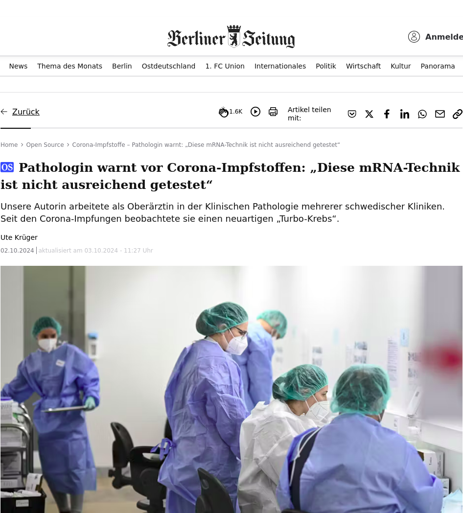 Un article publié par le Berliner Zeitung le 2 octobre 2024, dans le cadre de leur initiative « open source ». L’article en allemand : Pathologin warnt vor Corona-Impfstoffen: „Diese mRNA-Technik ist nicht ausreichend getestet“, www.berliner-zeitung.de